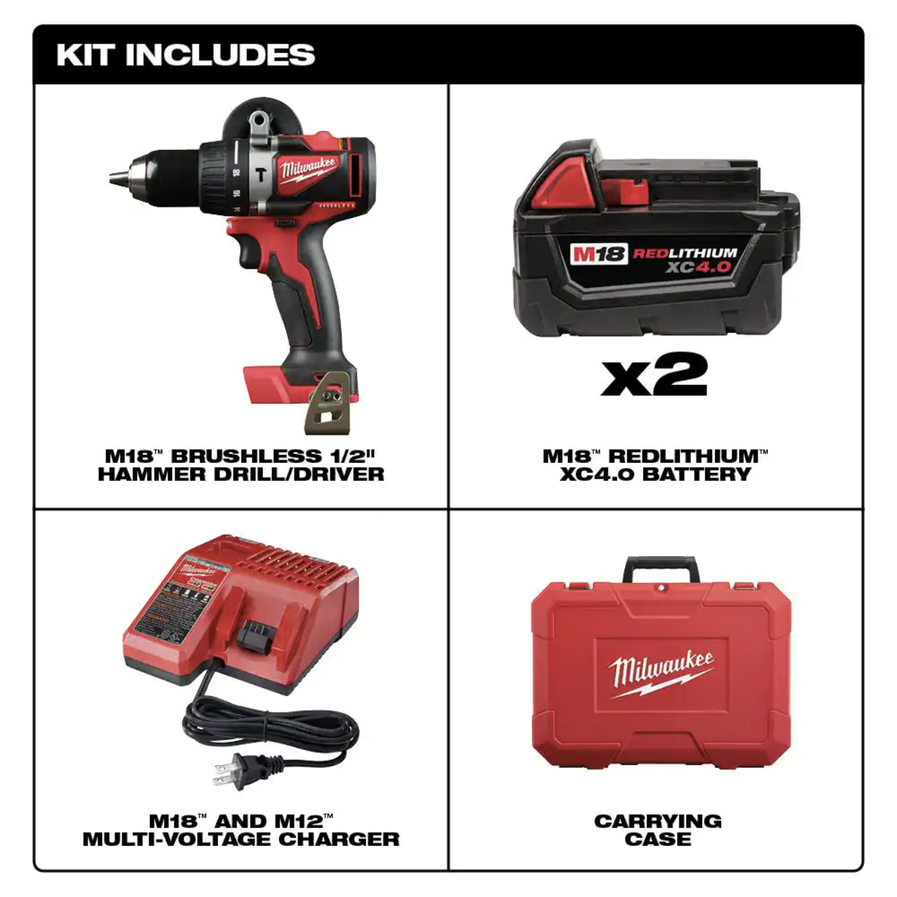 Milwaukee M18 18V Lithium-Ion Brushless Cordless 1/2 in. Compact Hammer Drill/Driver Kit 2902-22