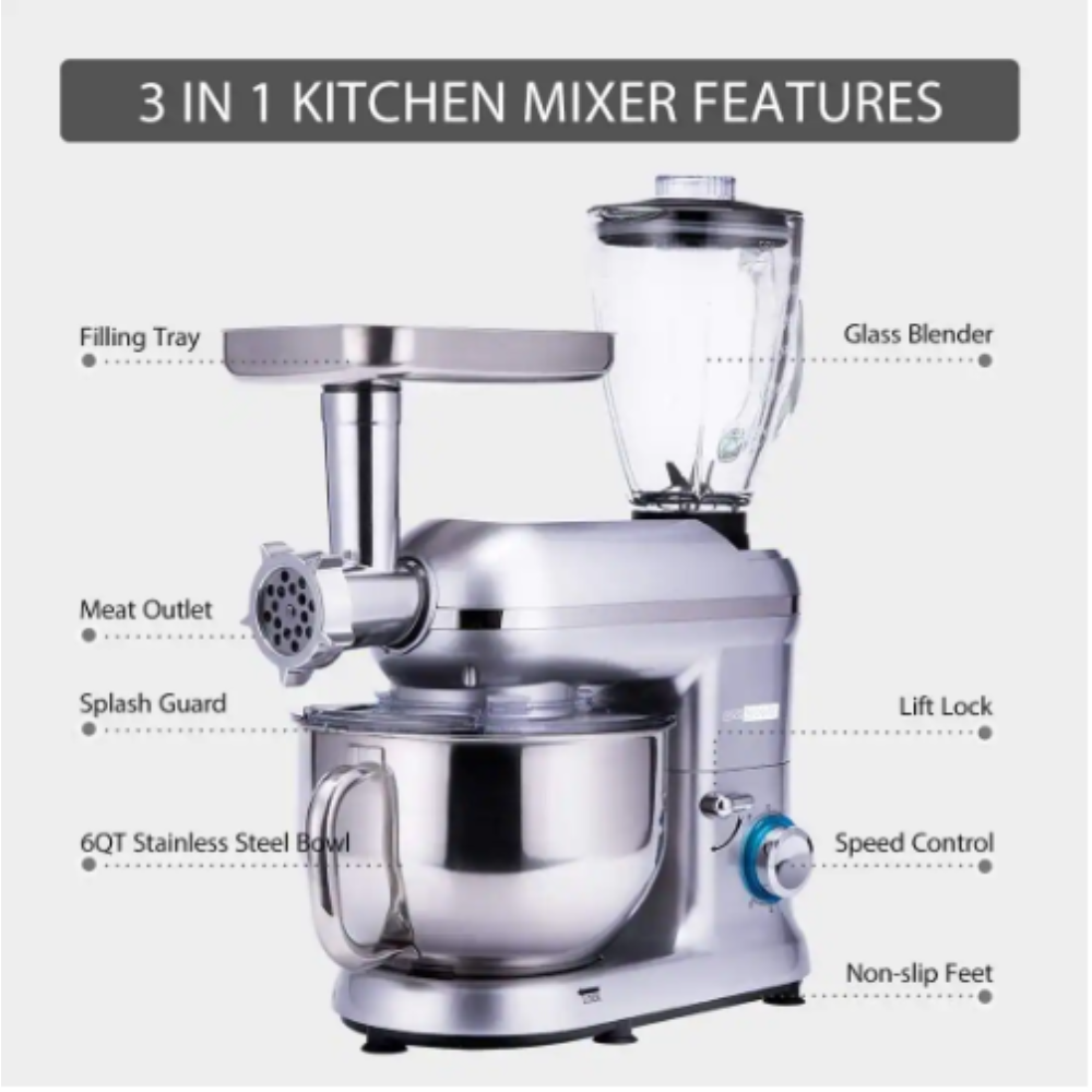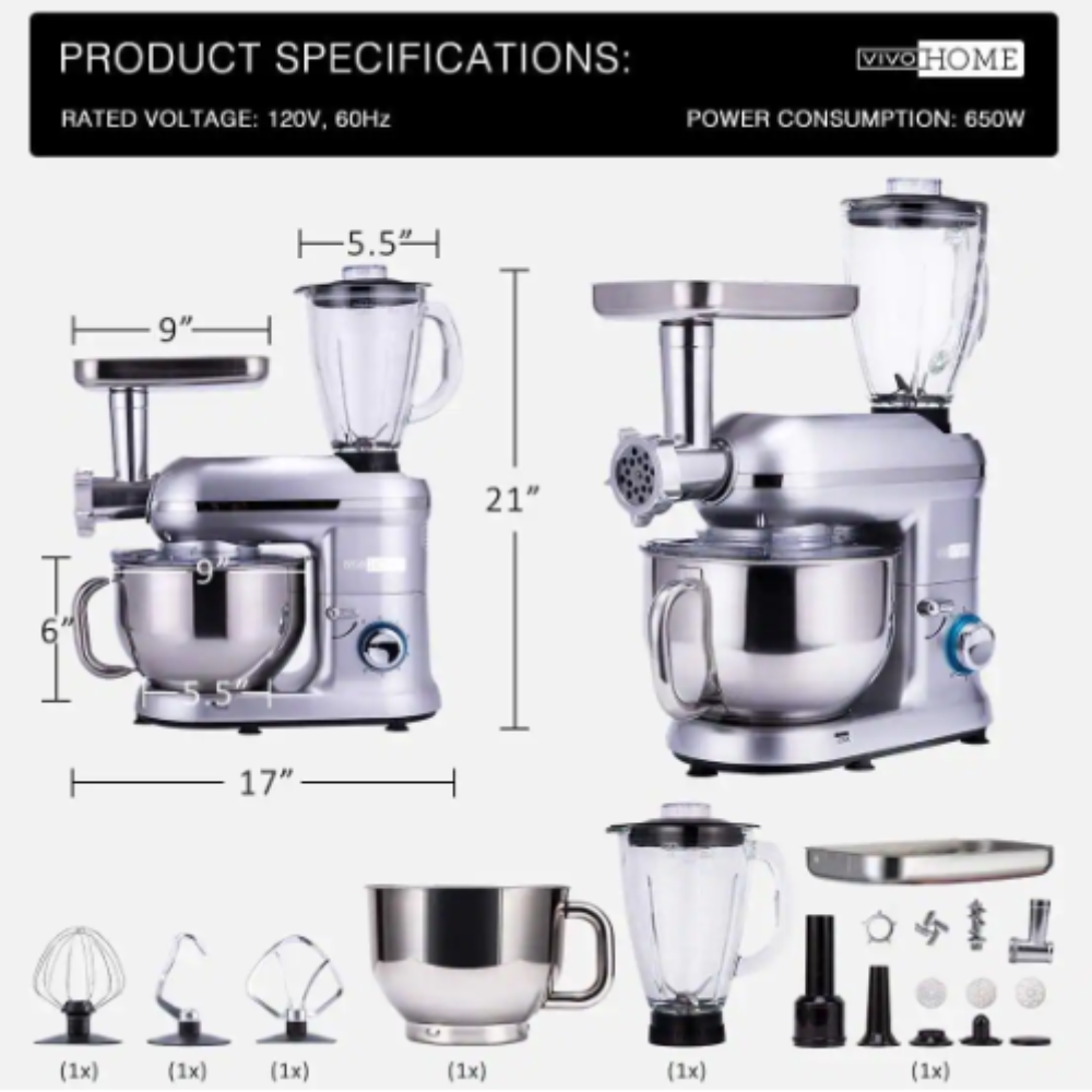 Vivohome 6 qt. 6- Speed Silver 3 in 1 Multifunctional Stand Mixer with Meat Grinder and Juice Blender. ETL Listed