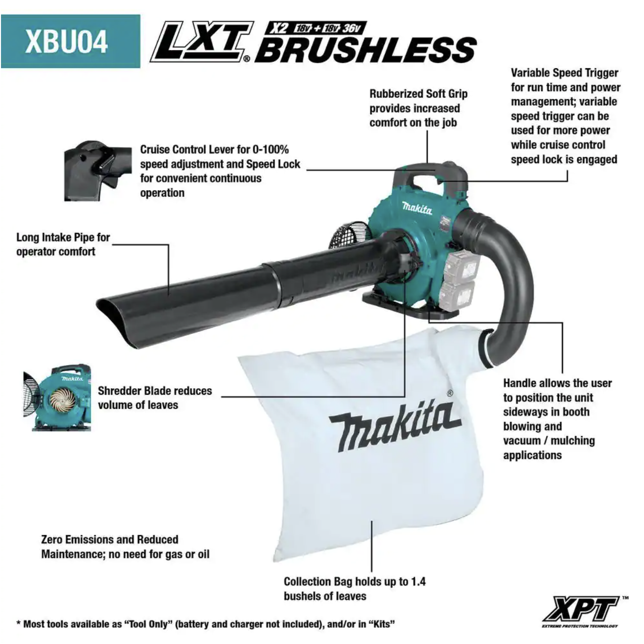 Makita 120MPH 473CFM 18V X2 (36V) LXT Lithium-Ion Brushless Cordless Blower with Vacuum Attachment Kit. Tool-Only (XBU04ZV)