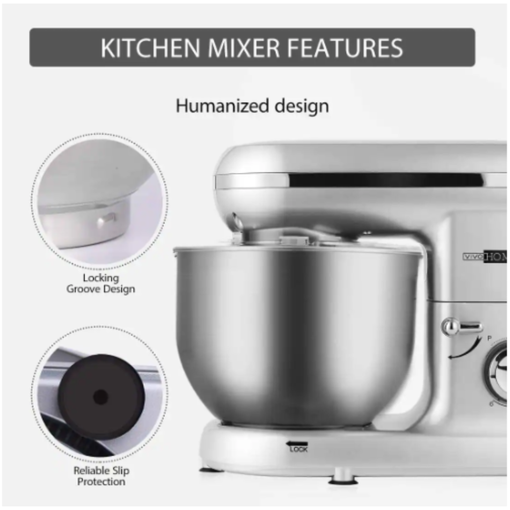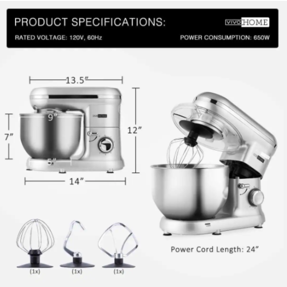 Vivohome 650-Watt 6 Qt. 6- Speed Silver Tilt-Head Kitchen Stand Mixer with Beater. Dough Hook and Wire Whip