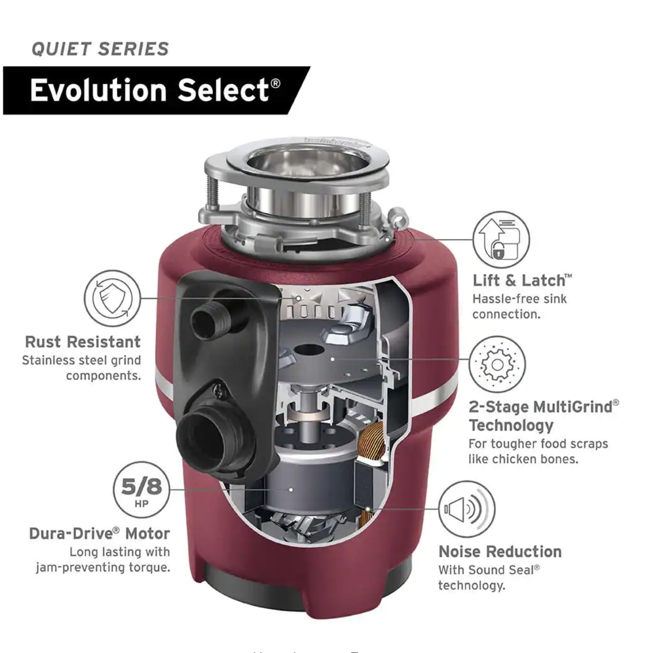 InSinkErator Evolution Select Lift & Latch Quiet Series 5/8 HP Continuous Feed Garbage Disposal with Power Cord Kit