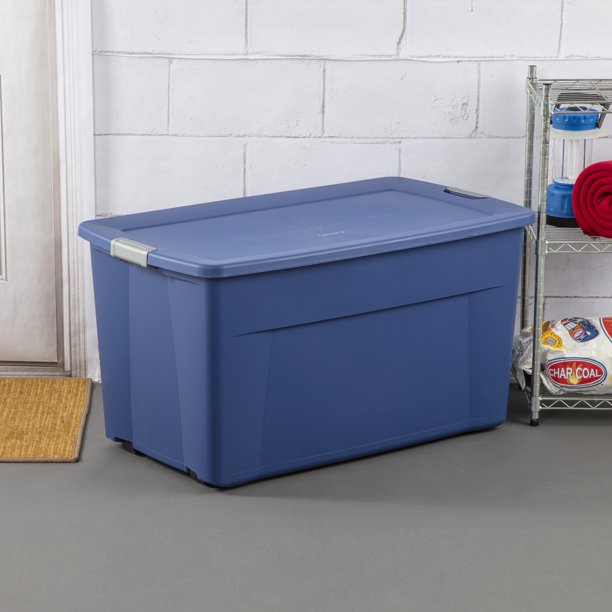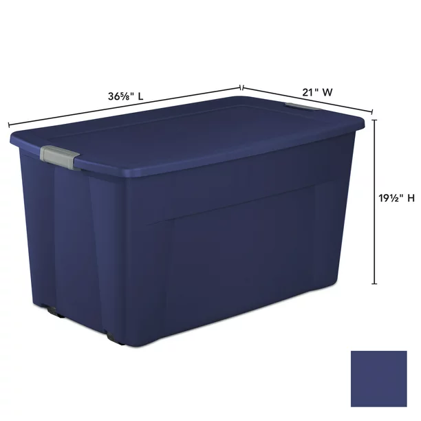 Sterilite 45 Gallon Wheeled Latch Tote Plastic. Stadium Blue. Set of 4