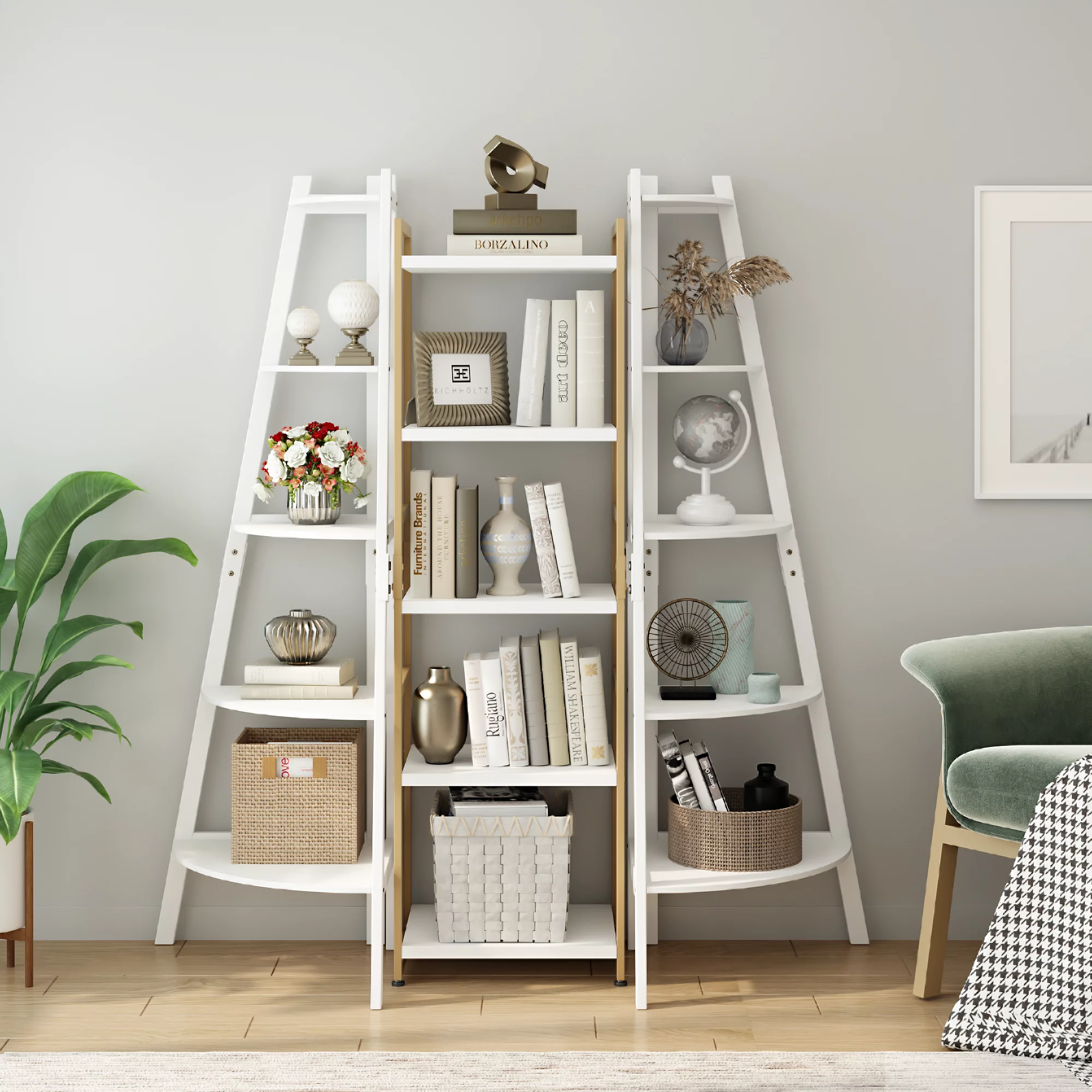 Homfa 5 Tier Gold and White Bookshelf. Tall Freestanding Storage Shelf with Metal Frame for Living Room