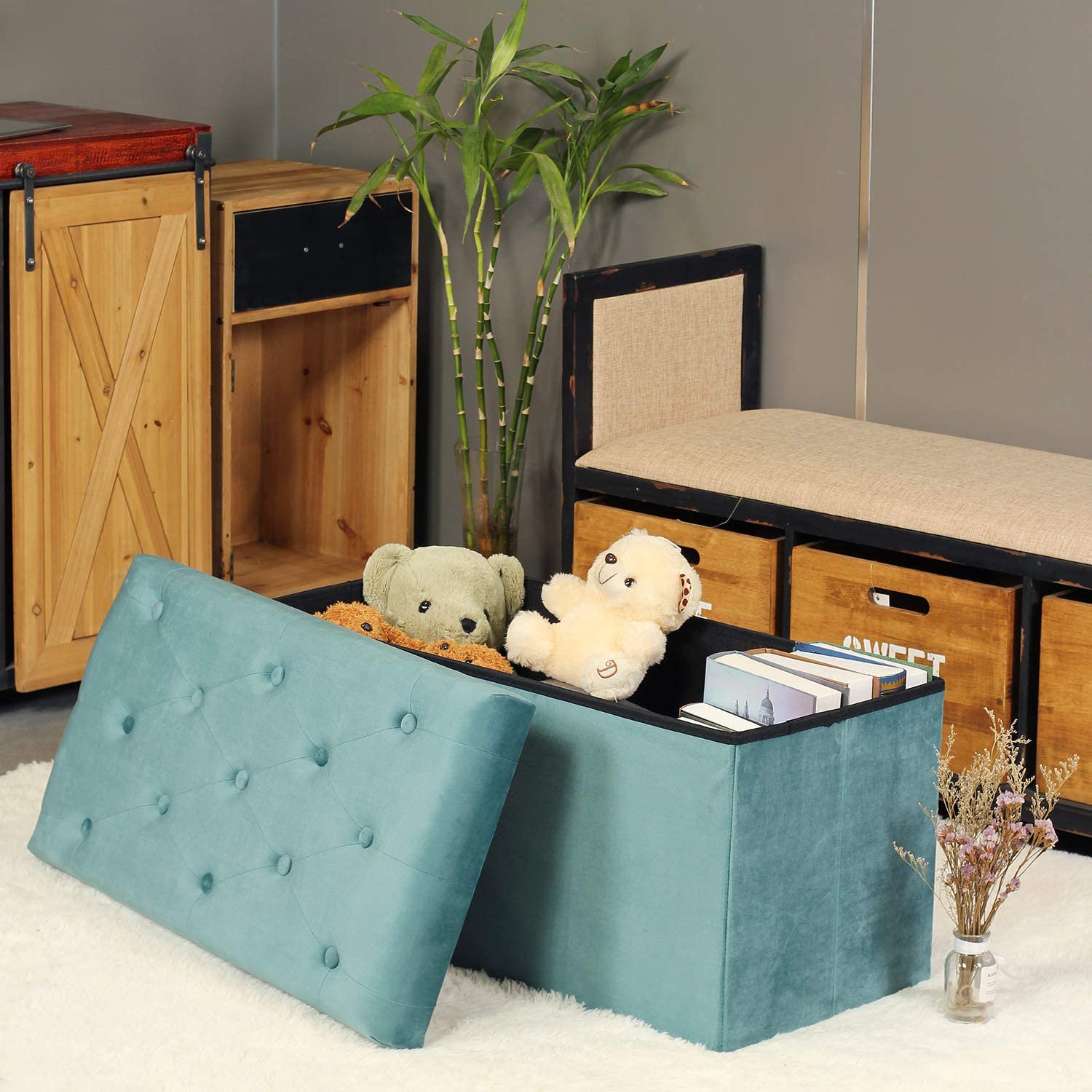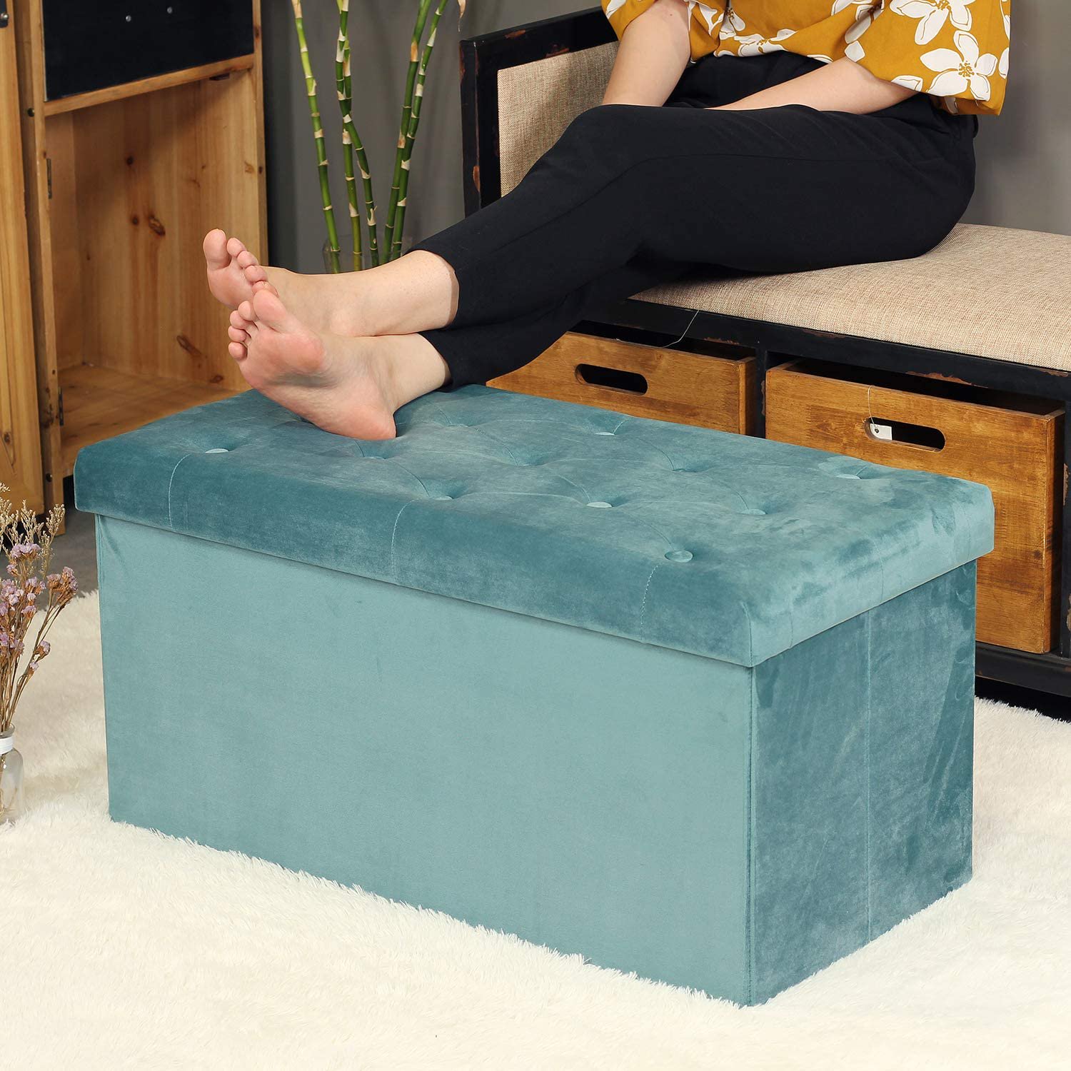Pinplus Folding Storage Ottoman Cube Bench. 30″ & 15″ Ottoman Foot Rest Stool Seat. Teal