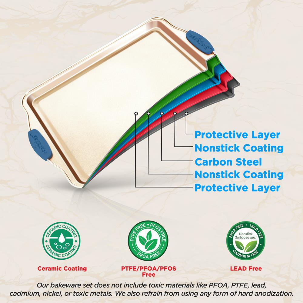 NutriChef 10-pcs Kitchen Oven Baking Pans. Deluxe Nonstick Gold Coating Carbon Steel Bakeware Set with Blue Silicone Handles