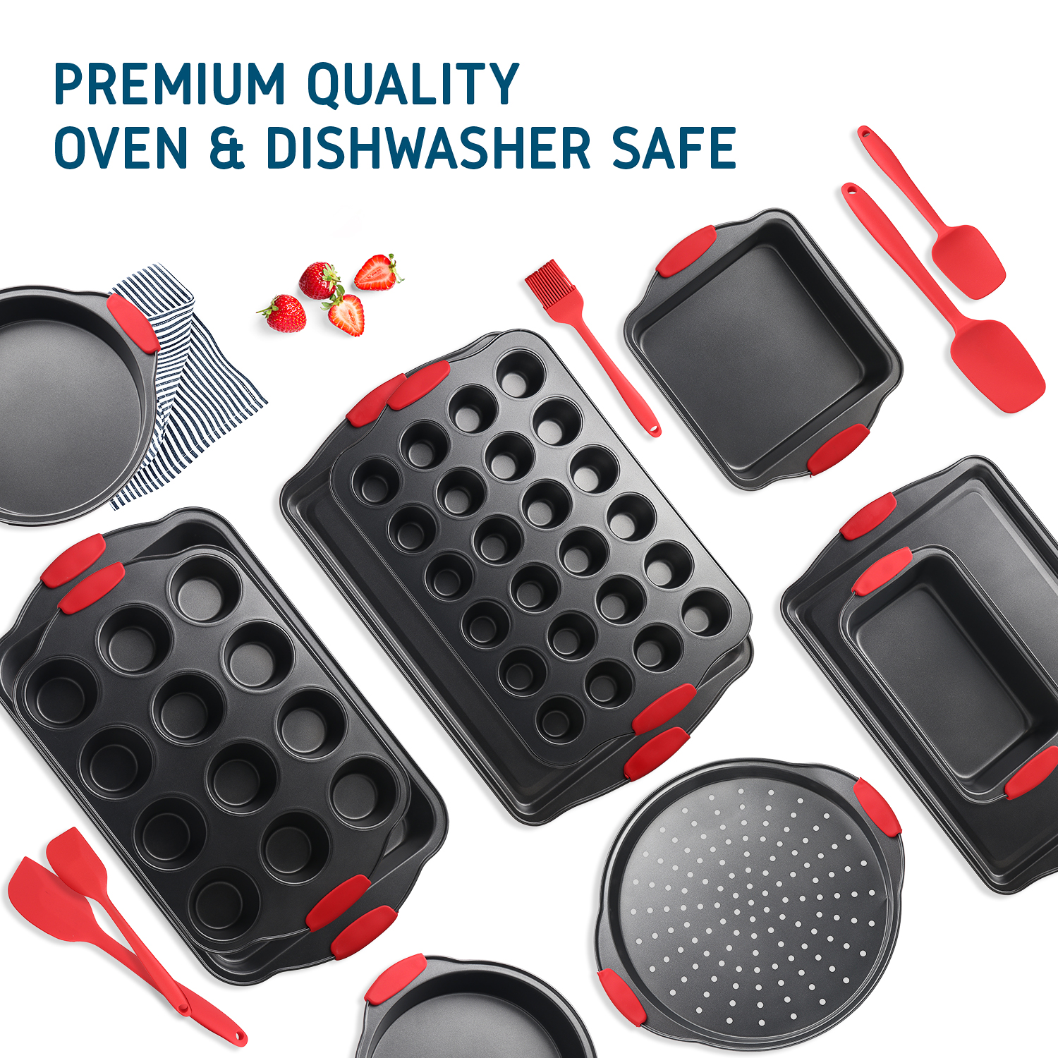 JoyTable Nonstick Bakeware Set. 15 PC Baking Tray Set With Silicone Handles & Utensils. Black