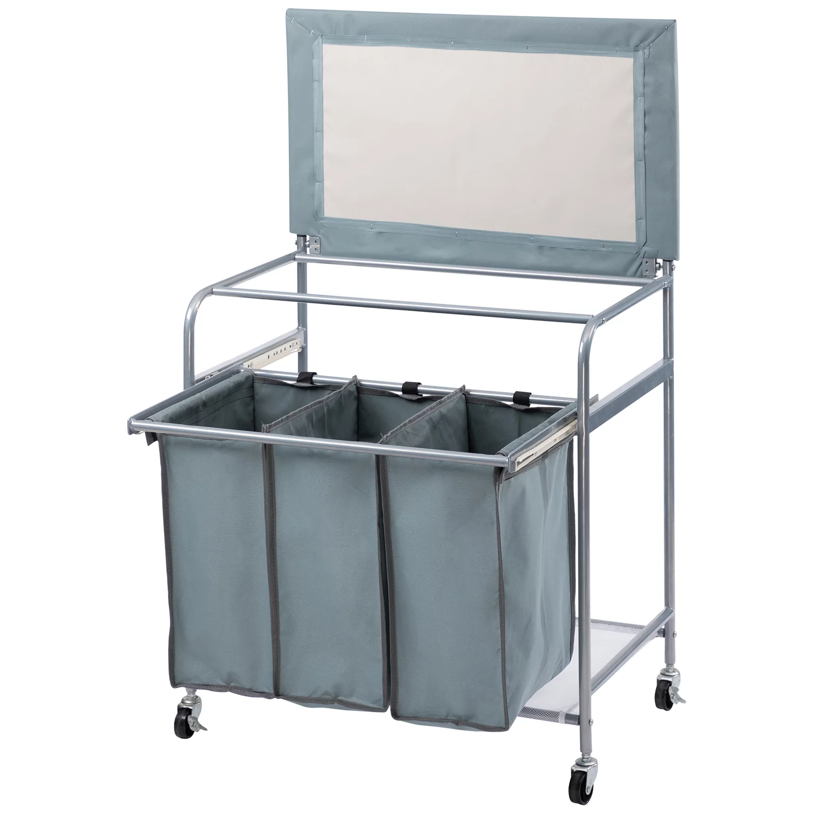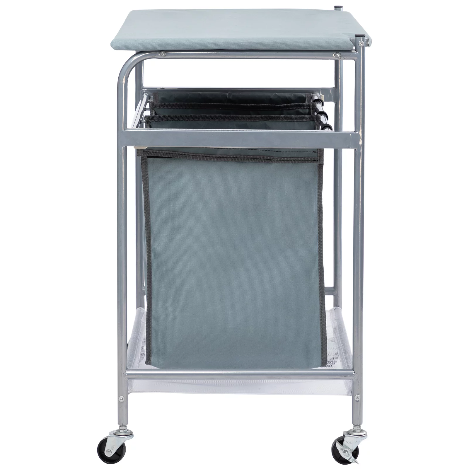 HollyHOME Rolling Laundry Sorter Cart with Openable Ironing Board and Side Pull 3 Bags. Blue Gray