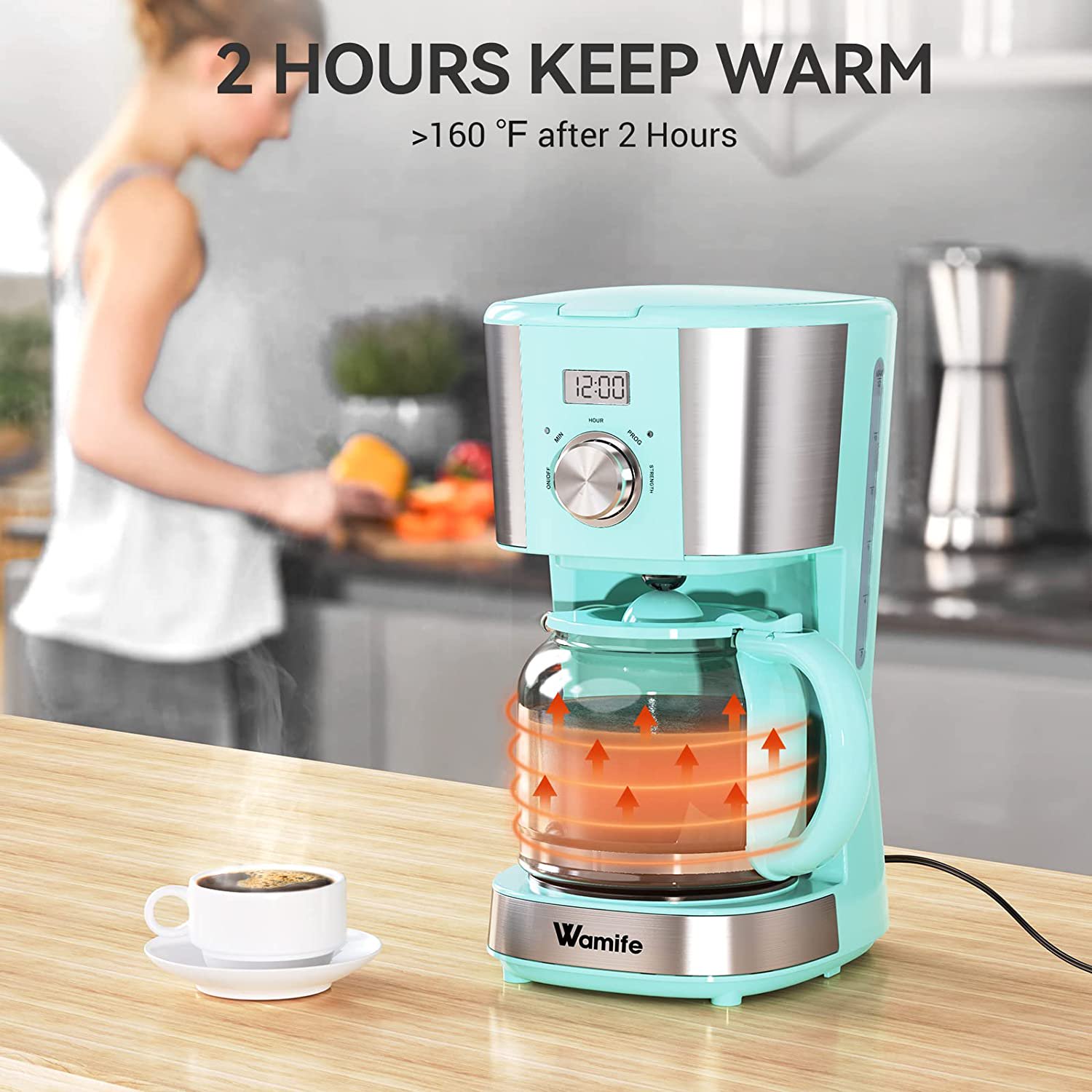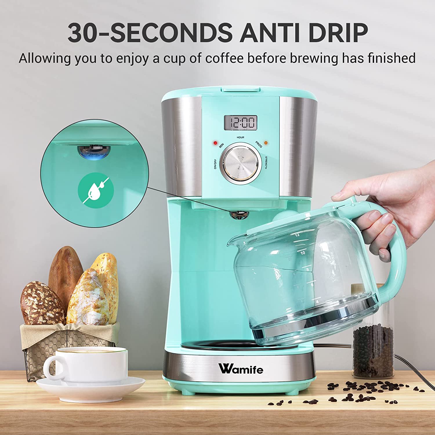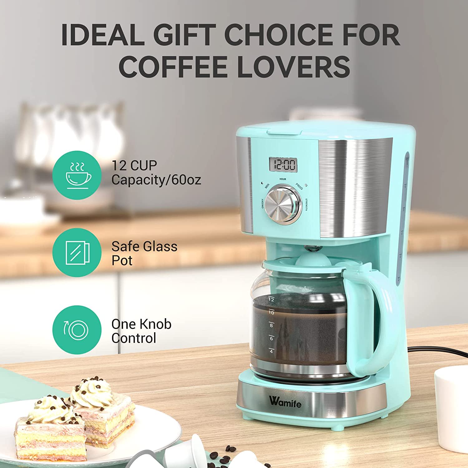 Wamife Drip Coffee Machine Coffee Brewer with Timer. Anti-Drip Pot. Reusable Filter. 12-Cup. Blue