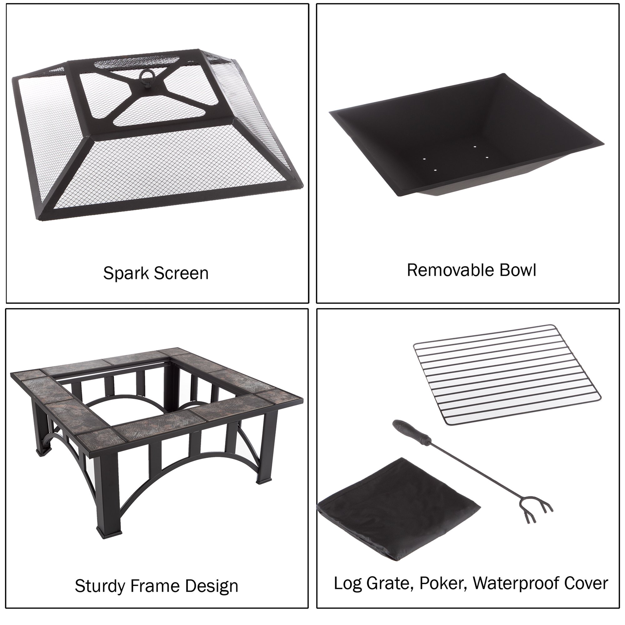Fire Pit Table 33-Inch Square Wood Burning Bonfire Pit with Marble Tile Edge. Spark Screen. Cover and Log Poker