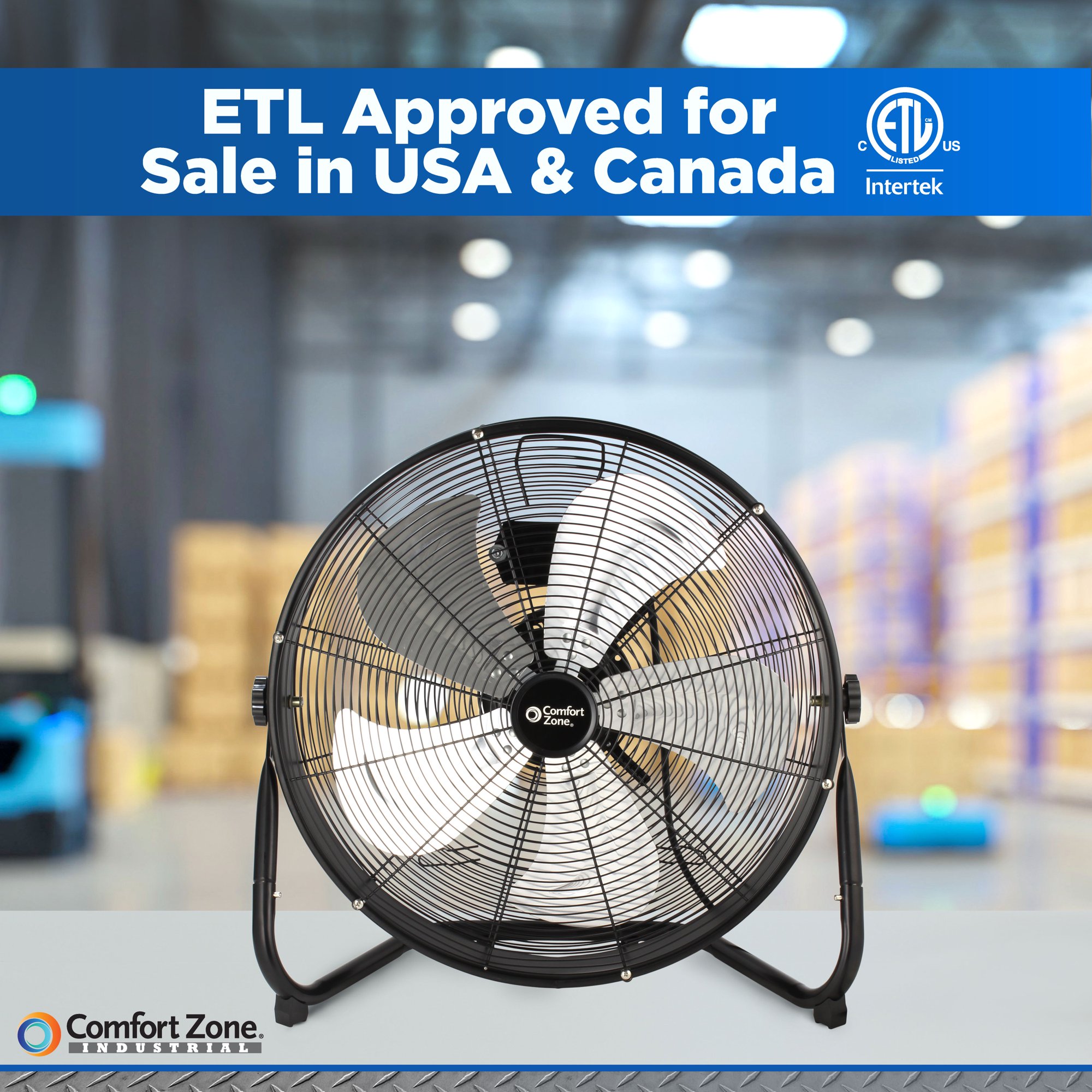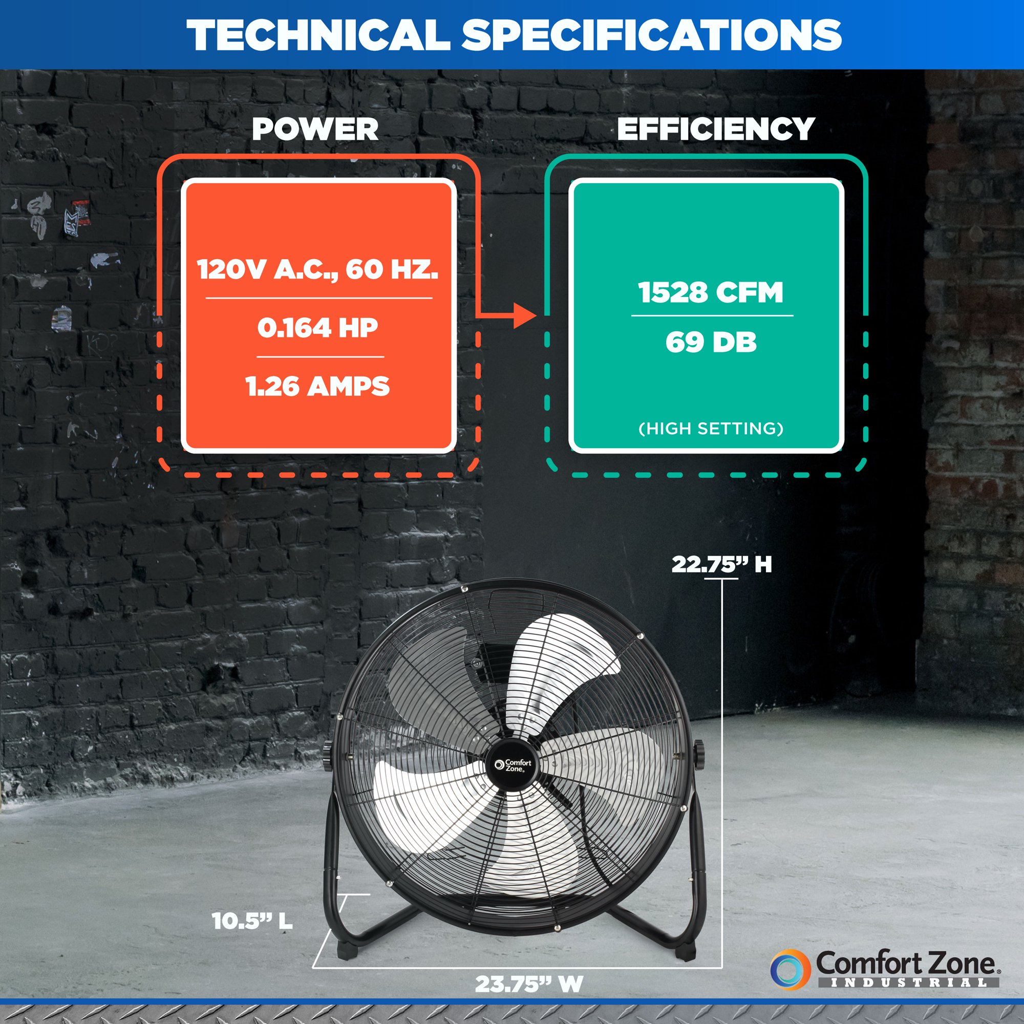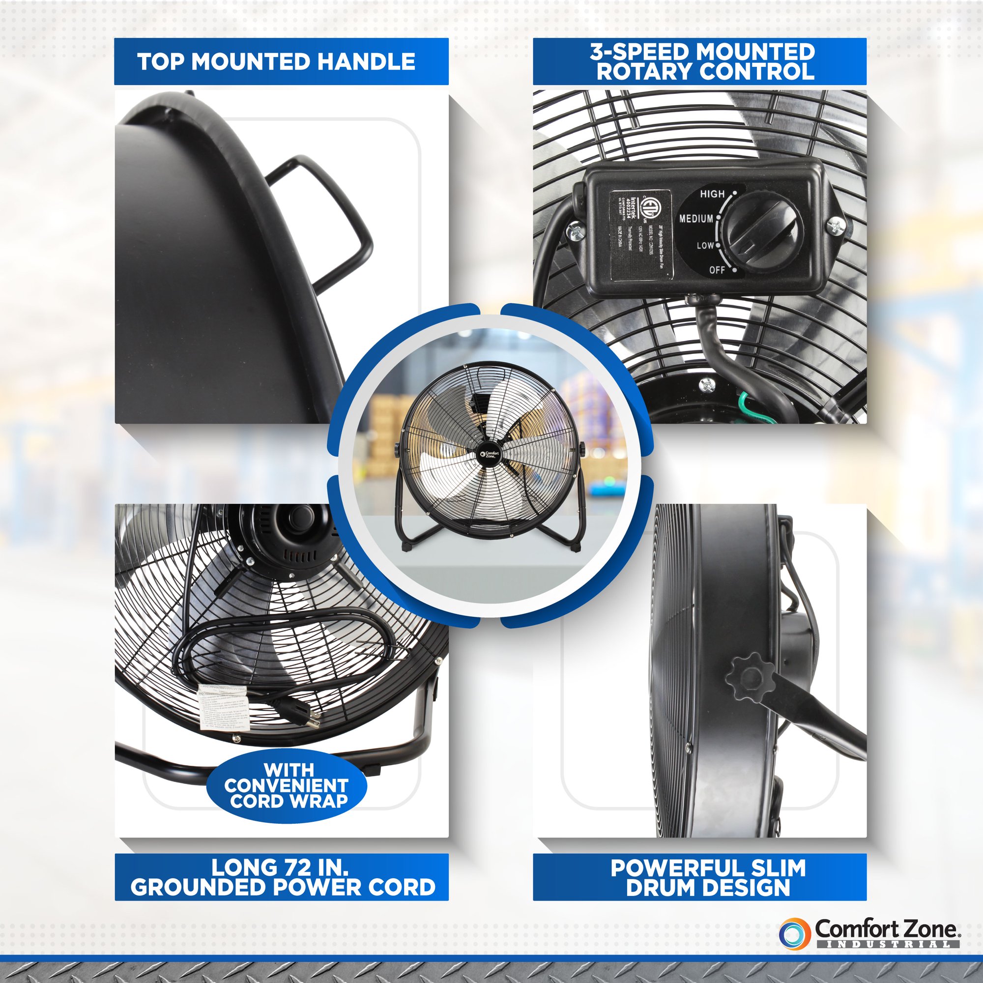 Comfort Zone 20 3-Speed High-Velocity Slim Industrial Drum Fan. 5-Aluminum Blades and Carry Handle. Black