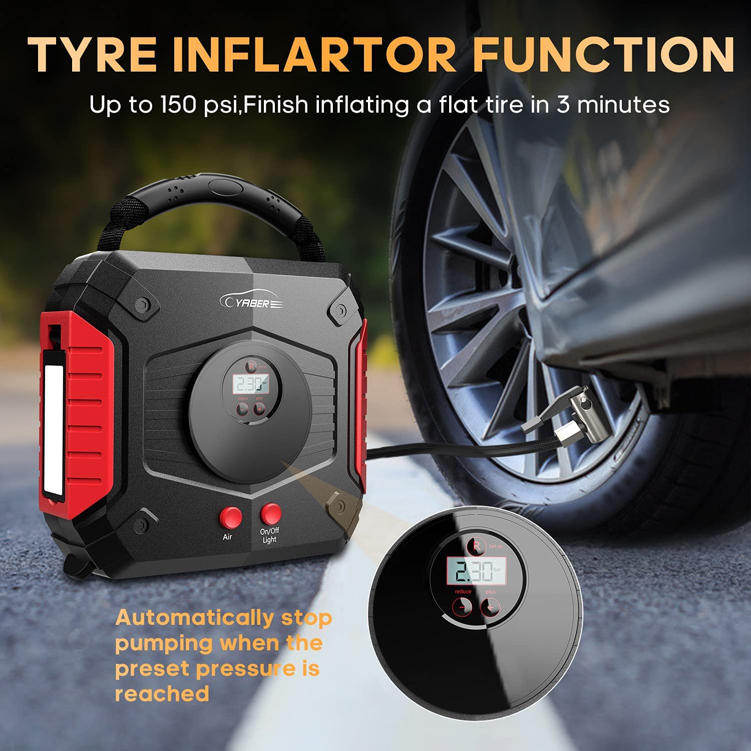 Yaber YA30 Jump Starter with Air Compressor 150 PSI 2500A Peak 24800 mAh Battery 12V Car Pack Super Safe