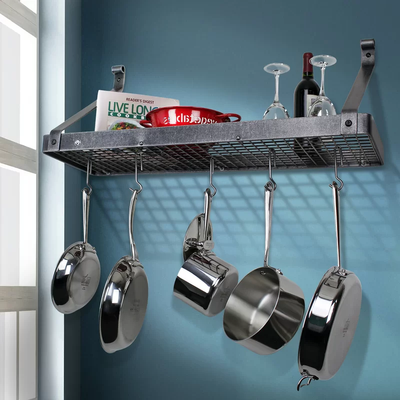 Enclume Gourmet Deep Bookshelf Handcrafted Wall Mounted Pot Rack. Hammered Steel. 17” H x 30” W x 13” D