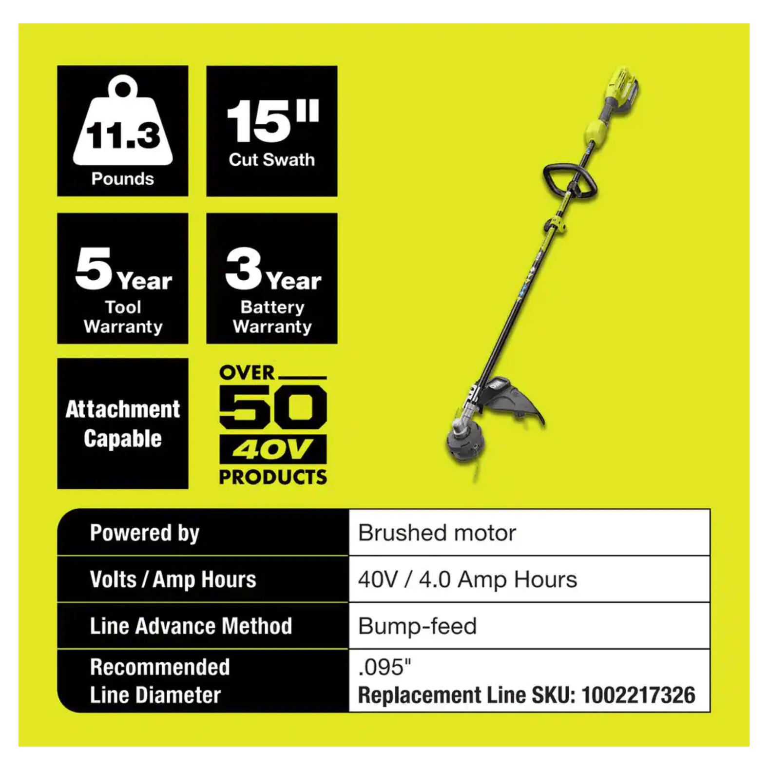 Ryobi 40V Expand-It Cordless Battery Attachment Capable String Trimmer with 4.0 Ah Battery & Charger (RY40250)