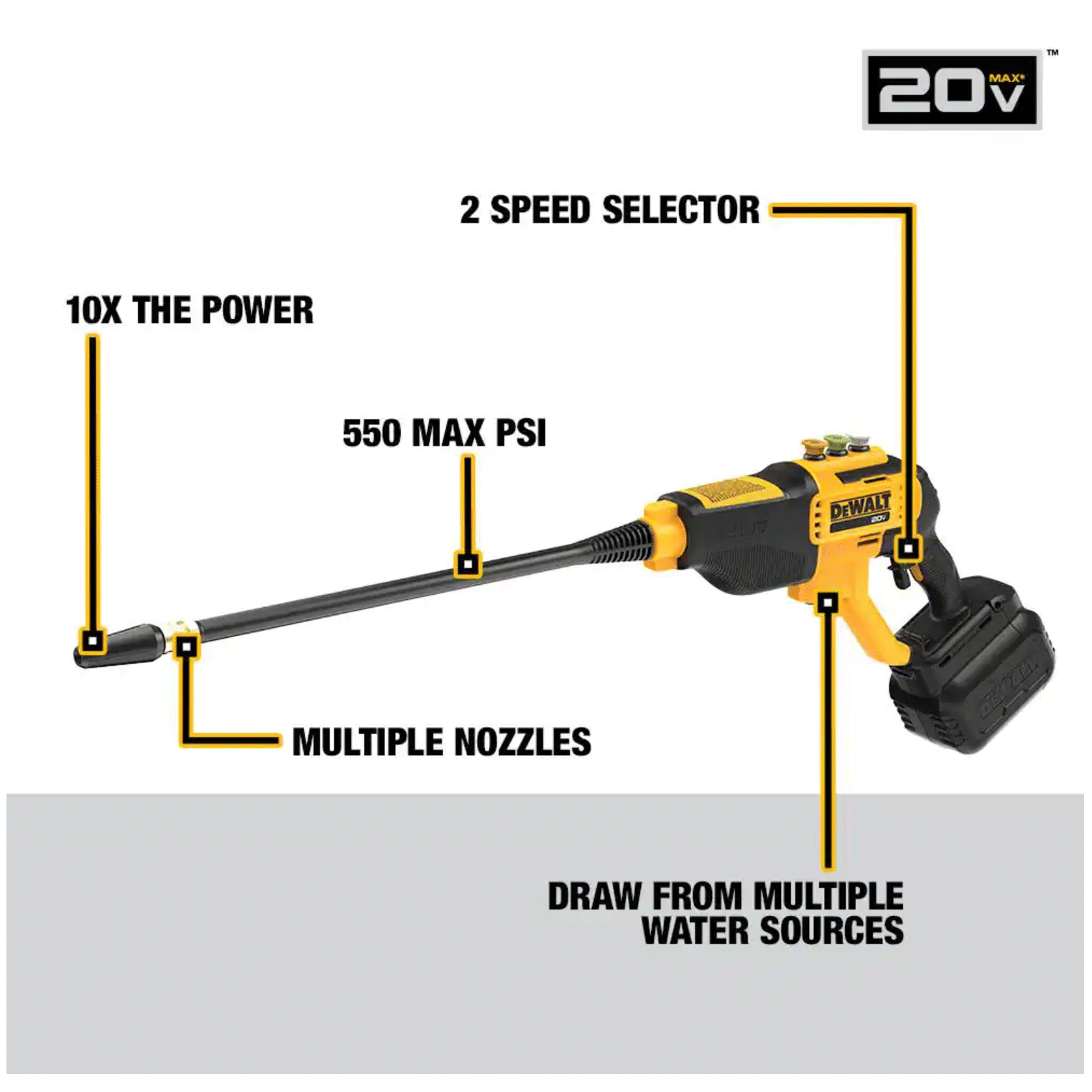 Dewalt 20V 550PSI. 1.0 GPM Cold Water Cordless Electric Power Cleaner with 4 Nozzles. Tool-Only (DCPW550B)