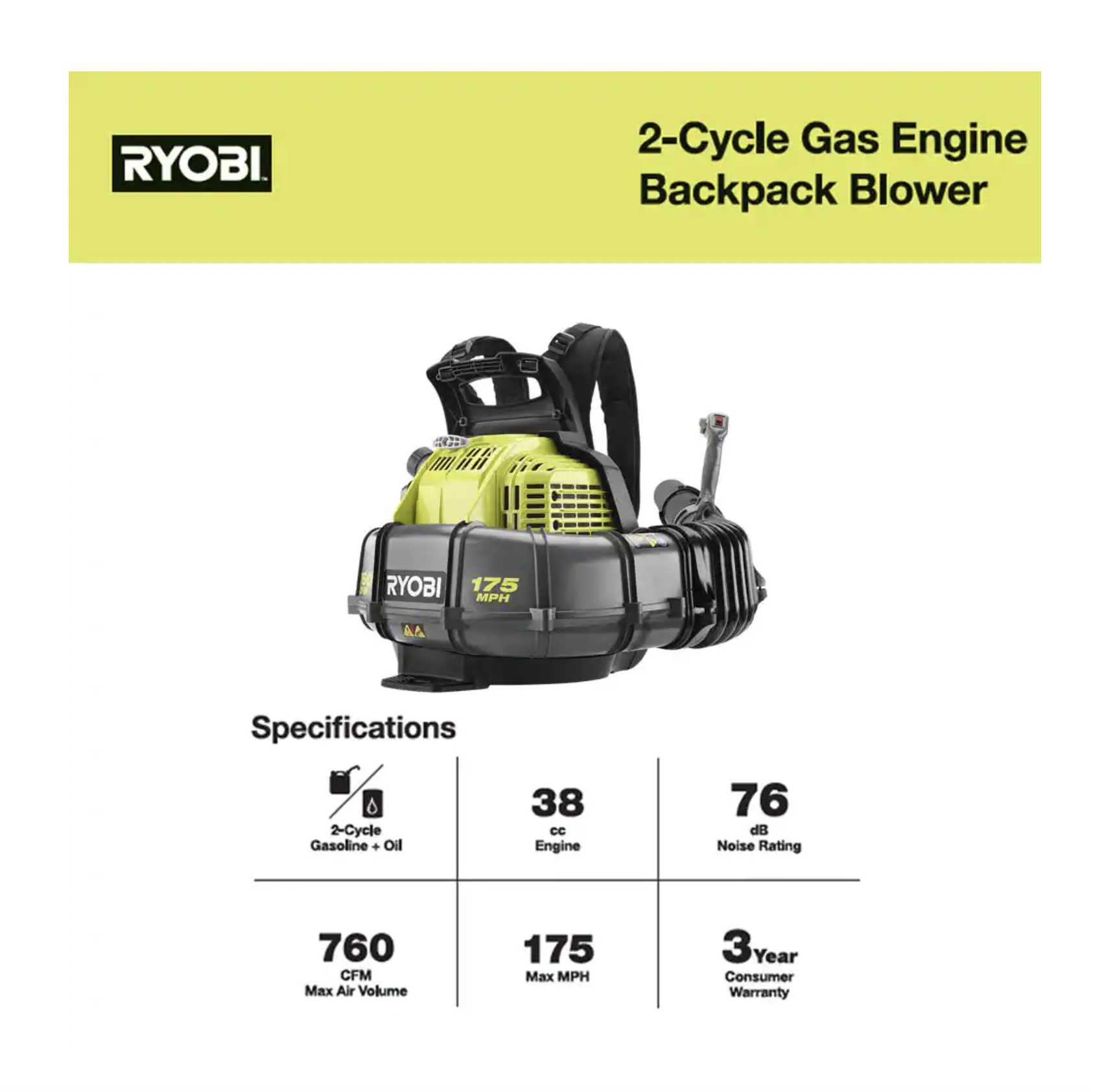 Ryobi 175 MPH 760 CFM 38cc Gas Backpack Leaf Blower