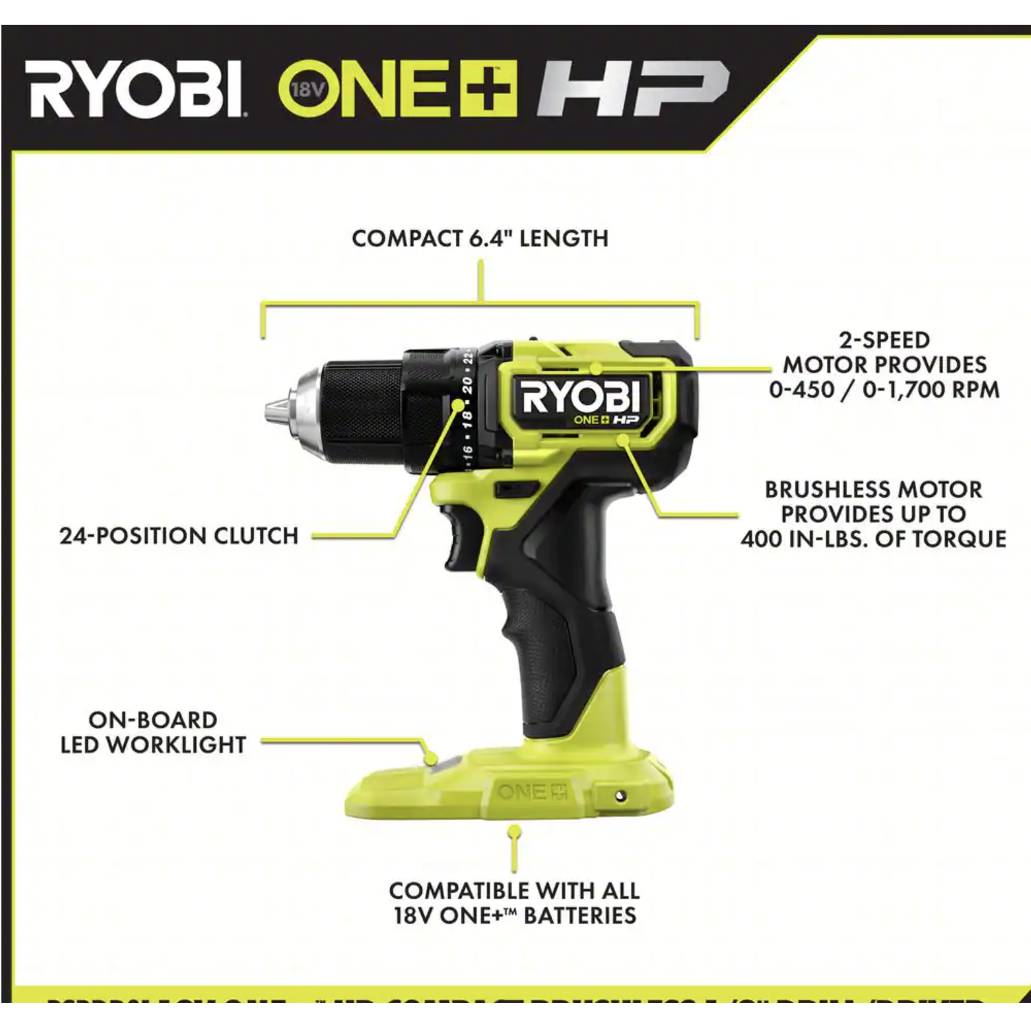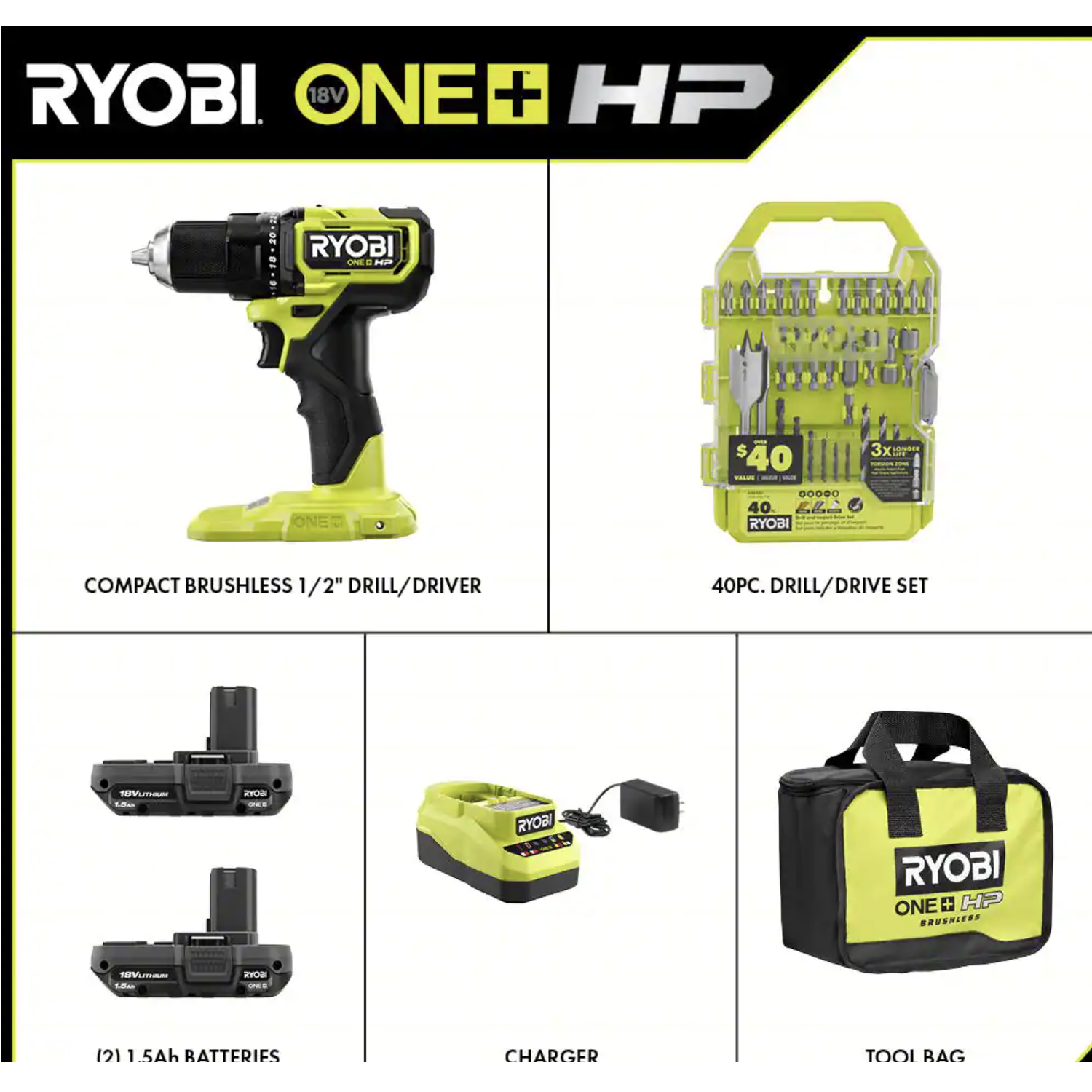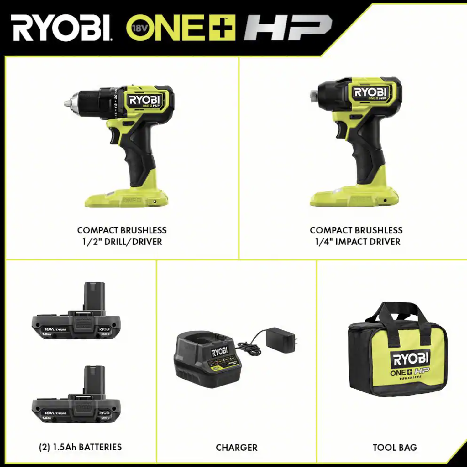 Ryobi One+ HP 18V Brushless Cordless Compact 1/2 in. Drill and Impact Driver Kit with (2) 1.5 Ah Batteries. Charger and Bag (PSBCK01K)