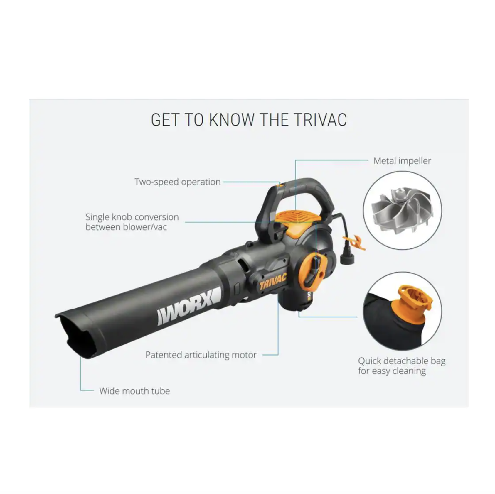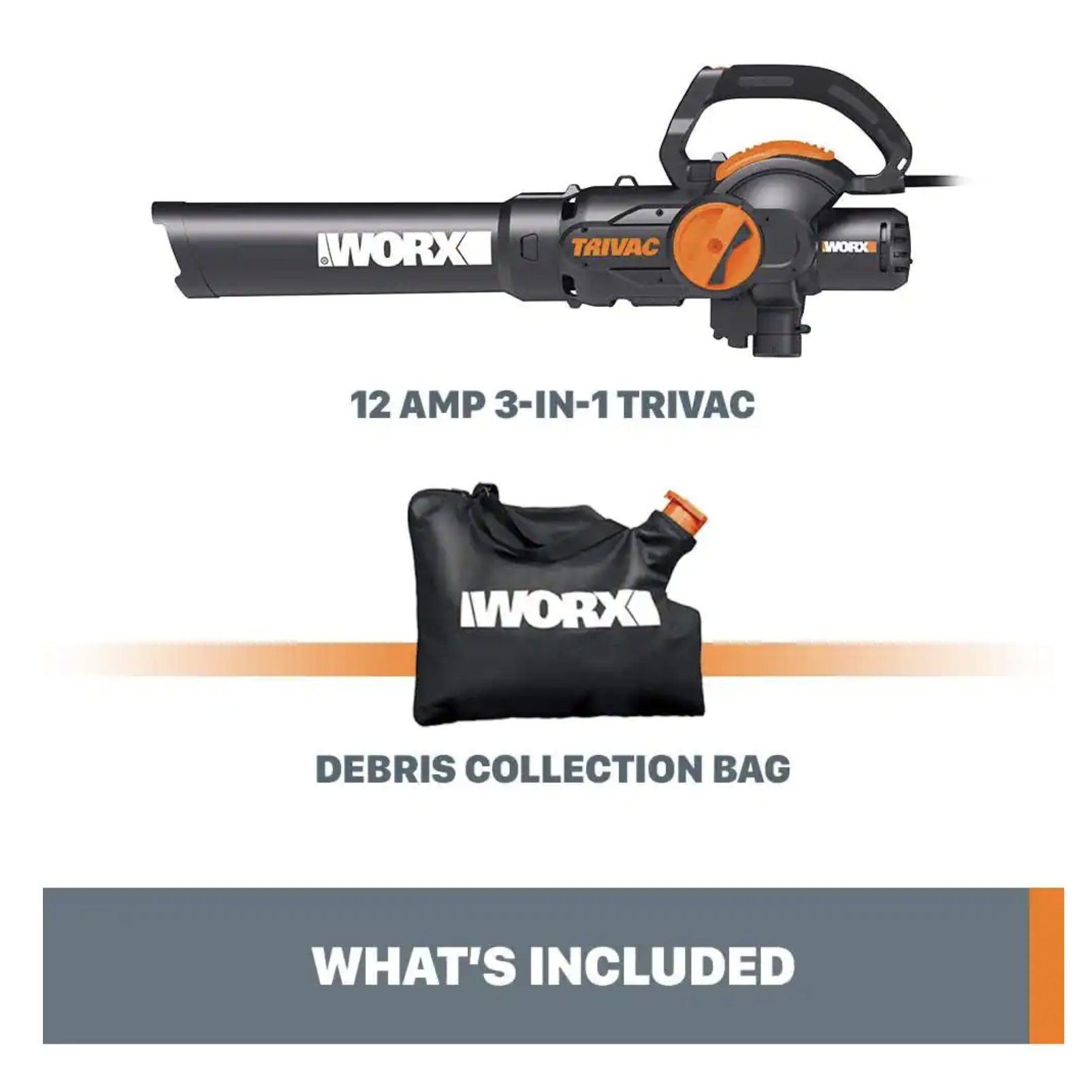 Worx TRIVAC 2.0 70 MPH 600 CFM Electric 12 Amp 3-in-1 Blower. Mulcher. Yard And Lawn Vacuum With Metal Impeller