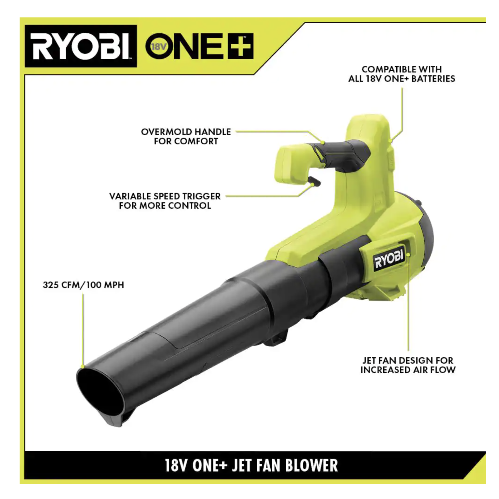 Ryobi ONE+ 18V 100 MPH 325 CFM Cordless Battery Variable Speed Jet Fan Leaf Blower (Tool Only)
