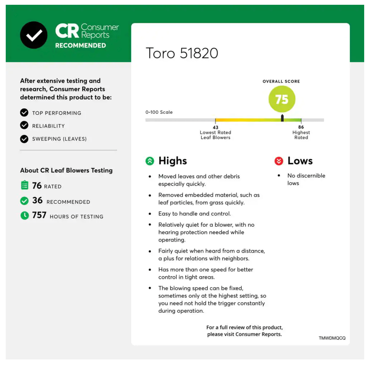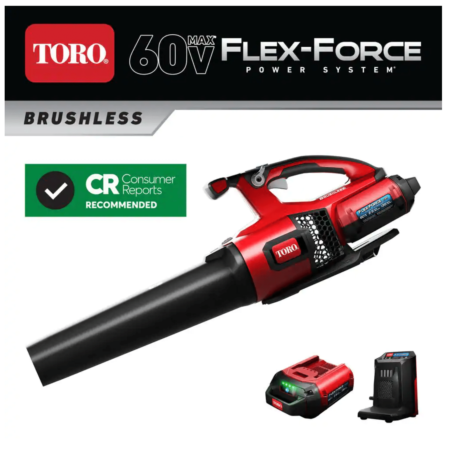 Toro 51820 120 MPH 605 CFM 60-Volt Max Lithium-Ion Brushless Cordless Leaf Blower. 2.5 Ah Battery & Charger Included