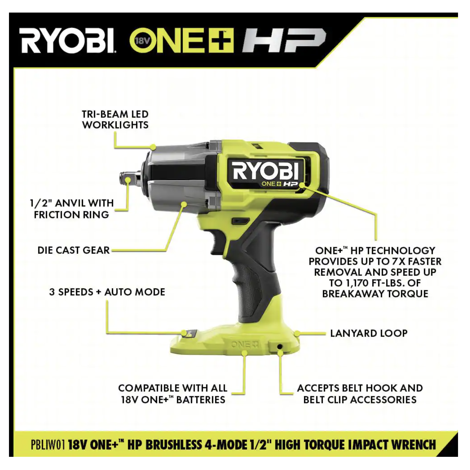 Ryobi One+ HP 18V Brushless Cordless 4-Mode 1/2 in. High Torque Impact Wrench. Tool Only (PBLIW01B)
