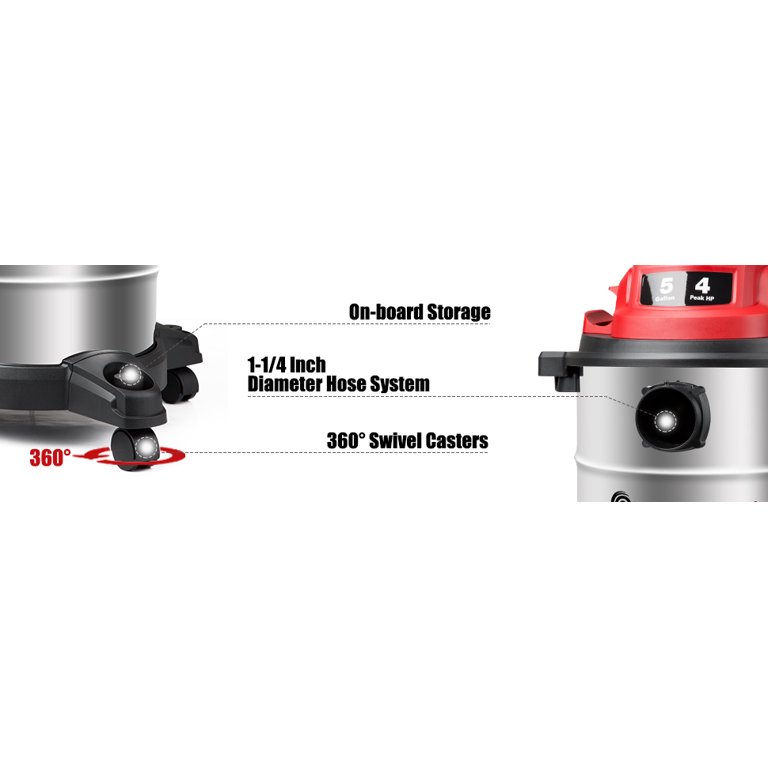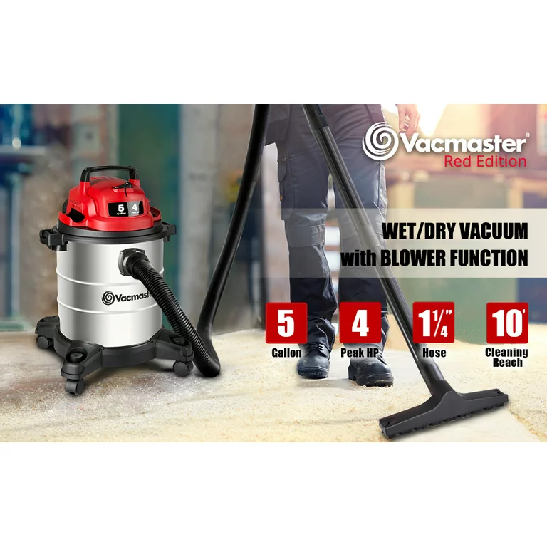Vacmaster Stainless Steel Wet Dry Shop Vacuum 5-Gallon 4-Peak HP 1-1/4 inch Hose. Red (VOC508S 1101)