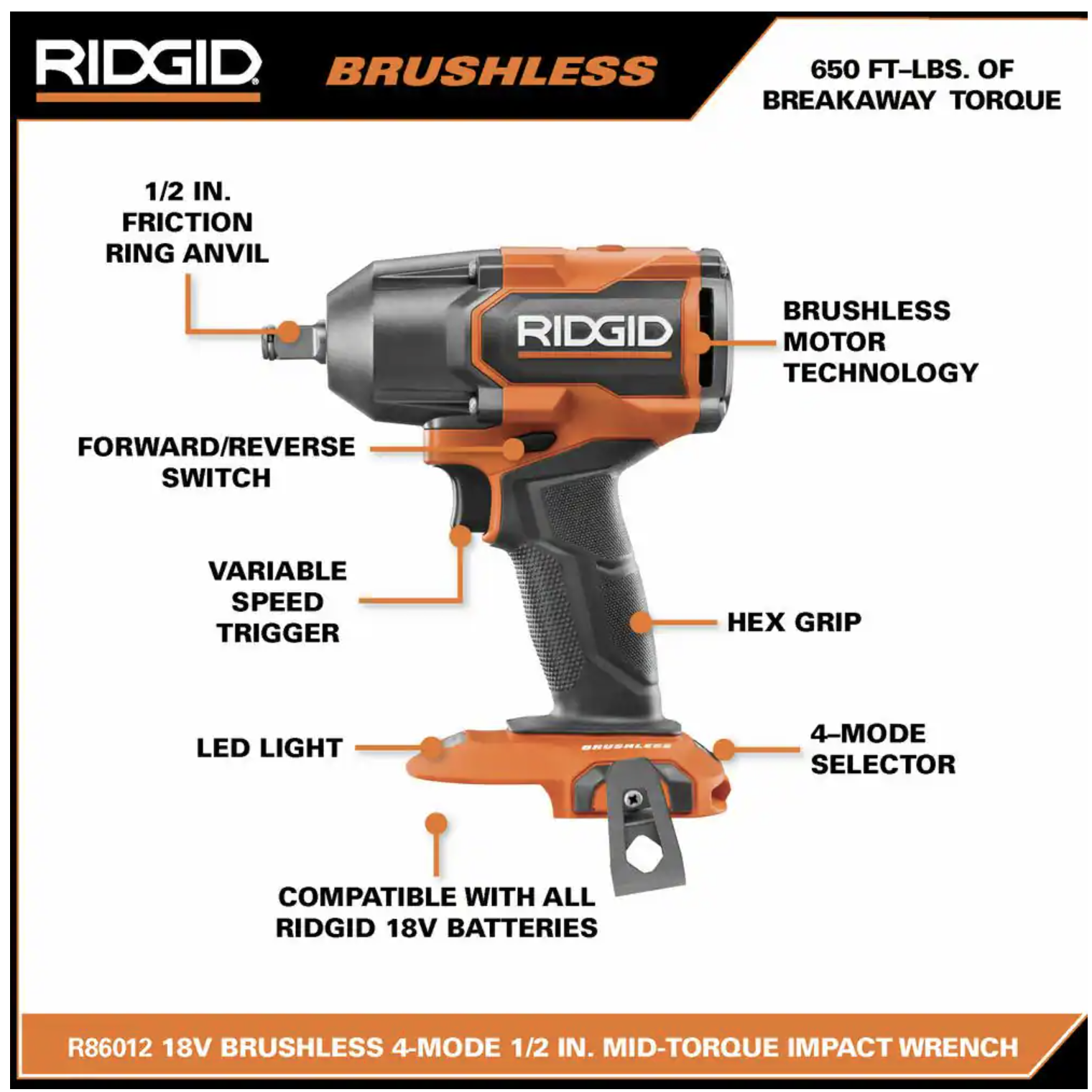Ridgid 18V Brushless 4-Mode 1/2 in. Mid-Torque Impact Wrench with 4.0 Ah Battery and Charger