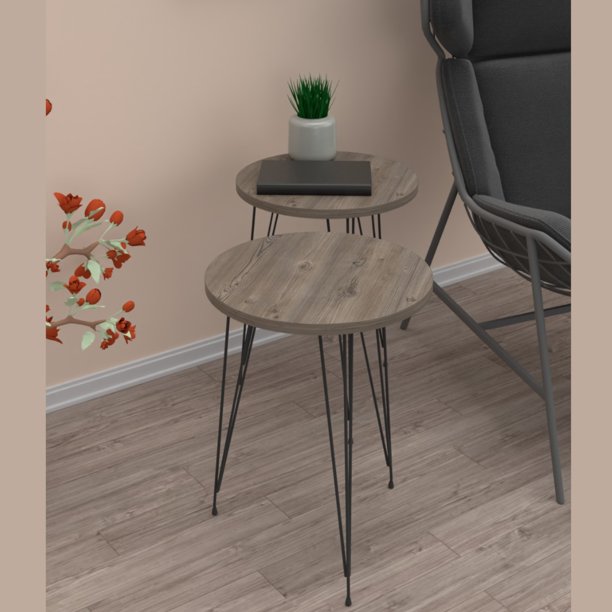 Pak Home Marble Look Wood Round Sofa Side Tables. Set Of 2 End Table. Pine Wood Grey