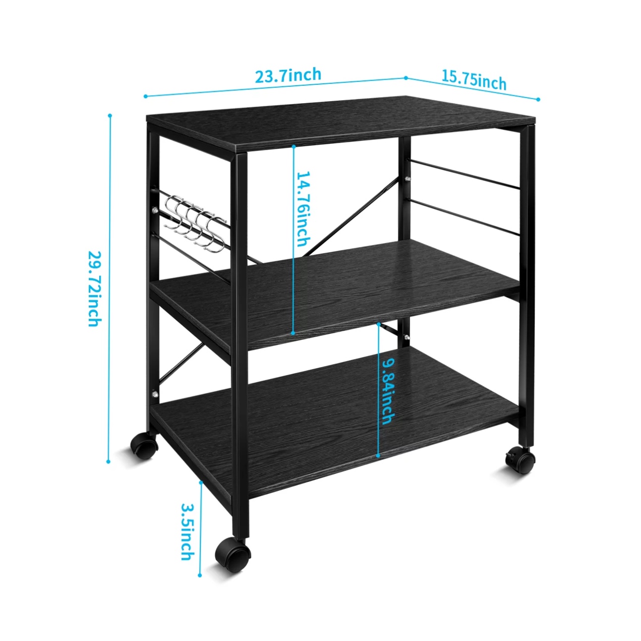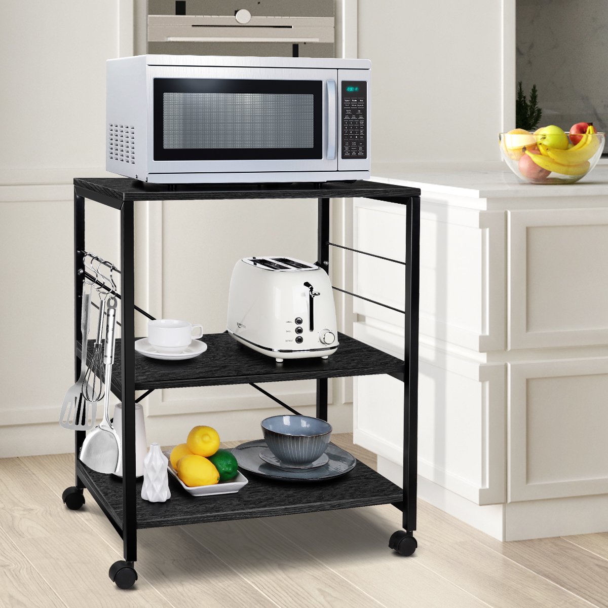 Cheflaud Kitchen Microwave Cart. 3-Tier Kitchen Utility Cart Vintage Rolling Bakers Rack with 5 Hooks. Black