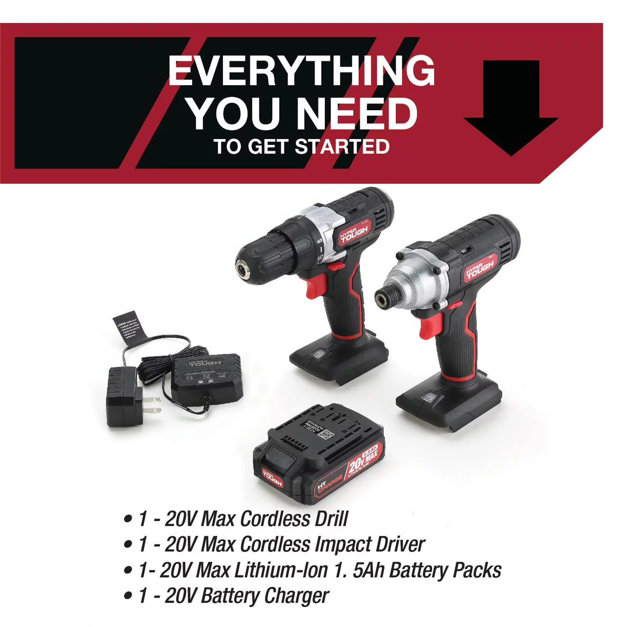 Hyper Tough 20V Max (2-Tool Set) 3/8 inch Cordless Drill & 1/4 inch Impact Driver Combo Kit