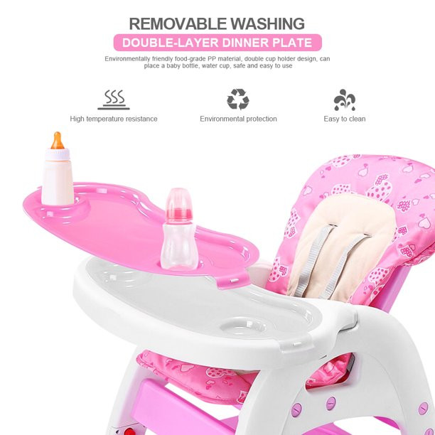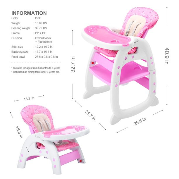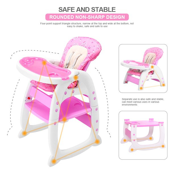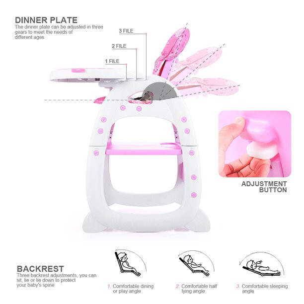 Hommoo 3 In 1 Baby High Chair. Convertible Play Table And Chair Set For Toddler. Adjustable Seat Back. Pink