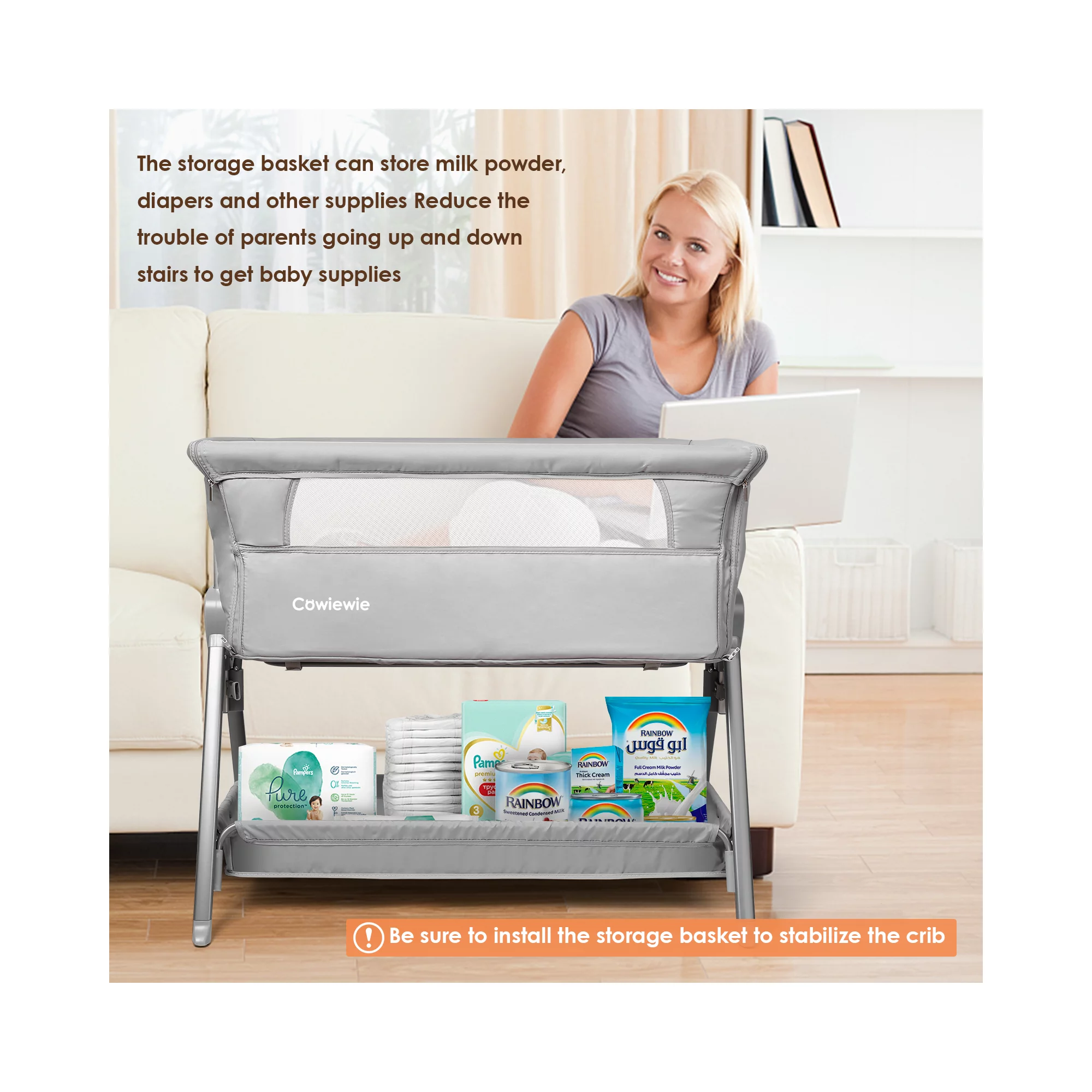 Cowiewie Bassinet for Babies. Large Volume and Mobile with Storage Basket Bedside Sleepers for 0-6 Months