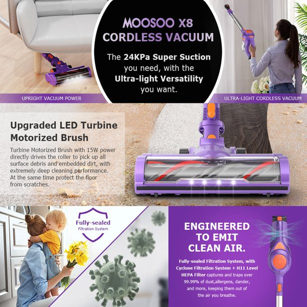 Moosoo X8 Cordless Vacuum Lightweight 4-in-1 Stick Vacuum Cleaner 24KPa Powerful Suction