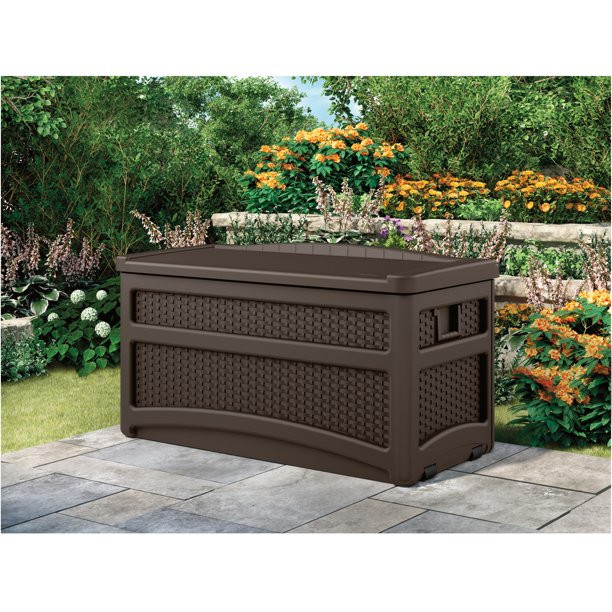 Suncast Outdoor 73 Gallon Resin and Wicker Deck Box with Seat. Java Brown