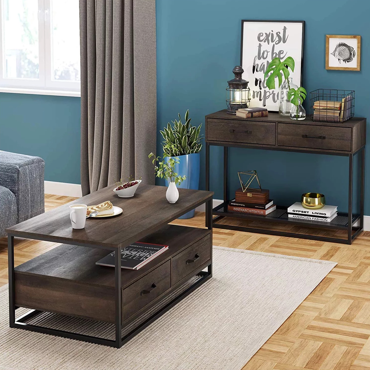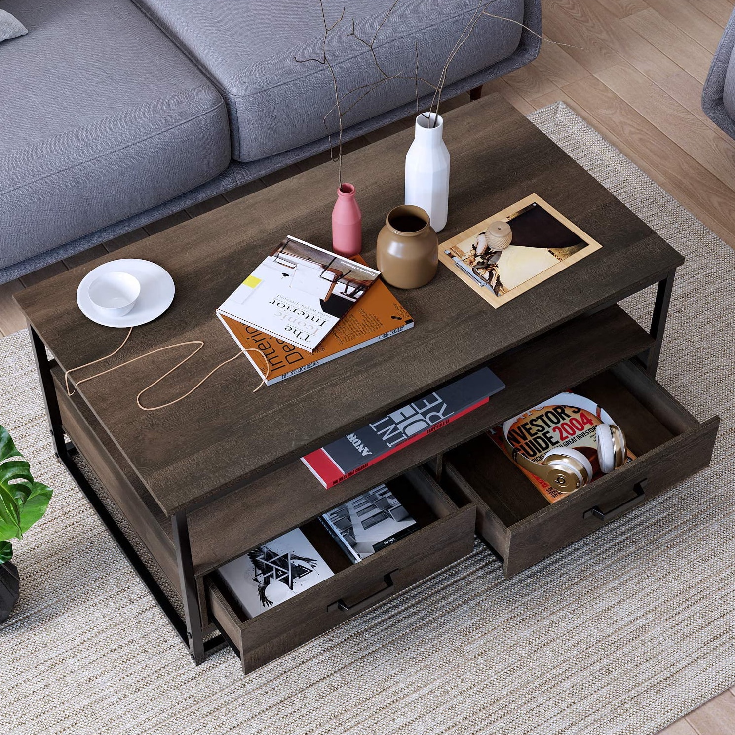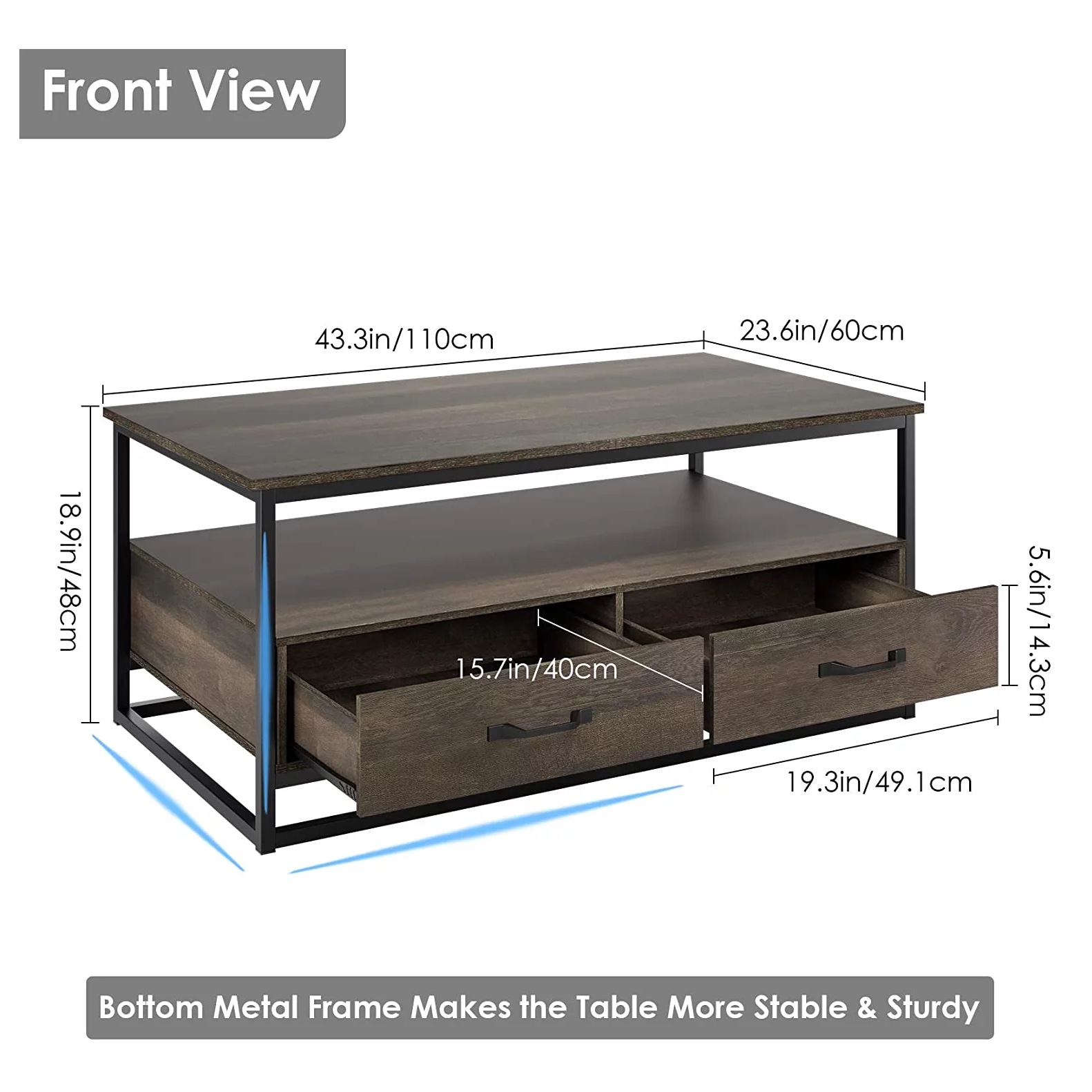 Homfa 43″ Wooden Coffee Table with Storage Shelf and 2 Drawers. Rustic Center Table for Home Office. Dark Brown