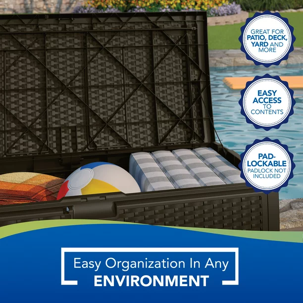 Suncast Indoor and Outdoor 73 Gallon Resin Deck Box with Seat. Mocha Brown