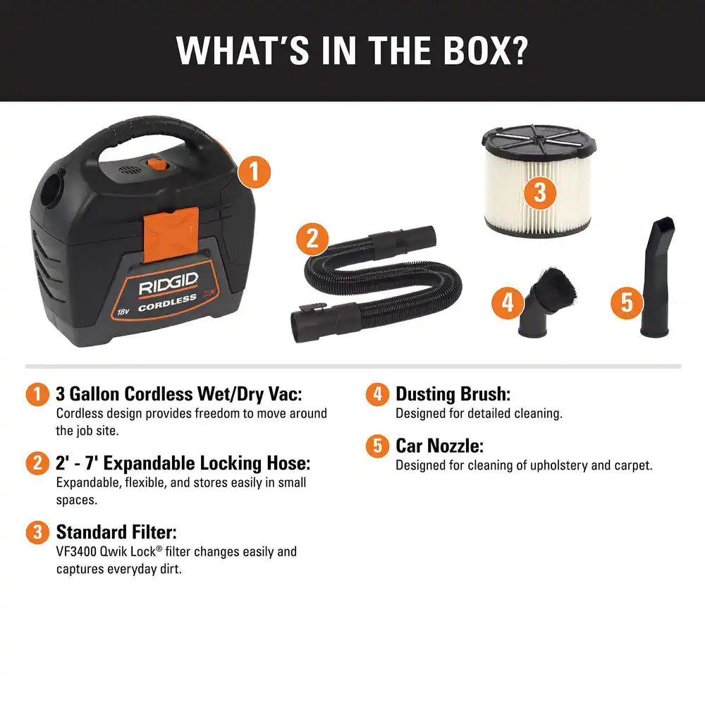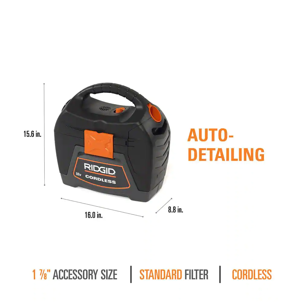 Ridgid 3 Gallon 18-Volt Cordless Handheld Wet/Dry Shop Vacuum (Tool Only) With Filter. Expandable Locking Hose and Accessories