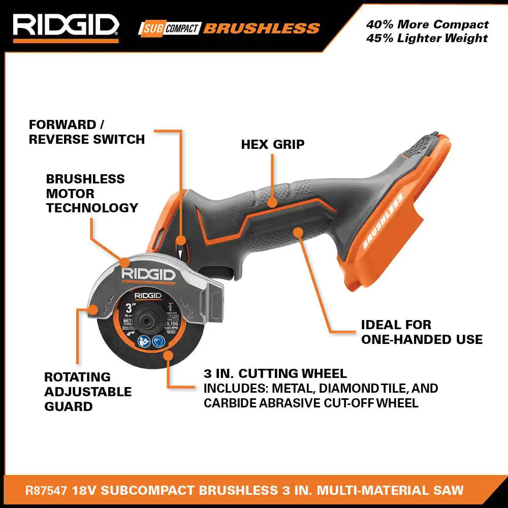 Ridgid 18V SubCompact Brushless Cordless 3 in. Multi-Material Saw (Tool Only) With (3) Cutting Wheels