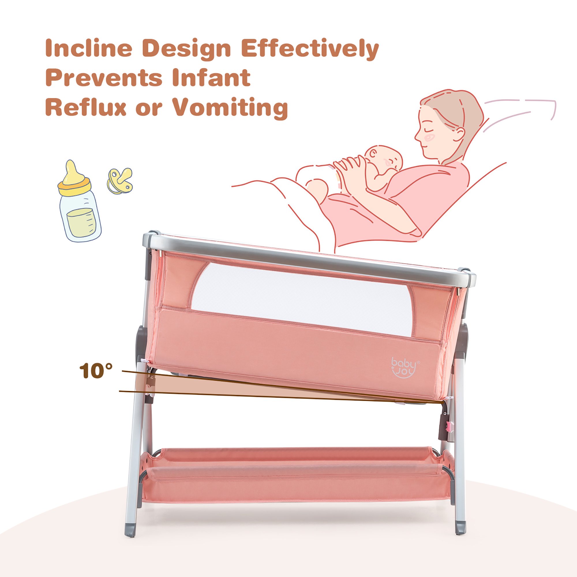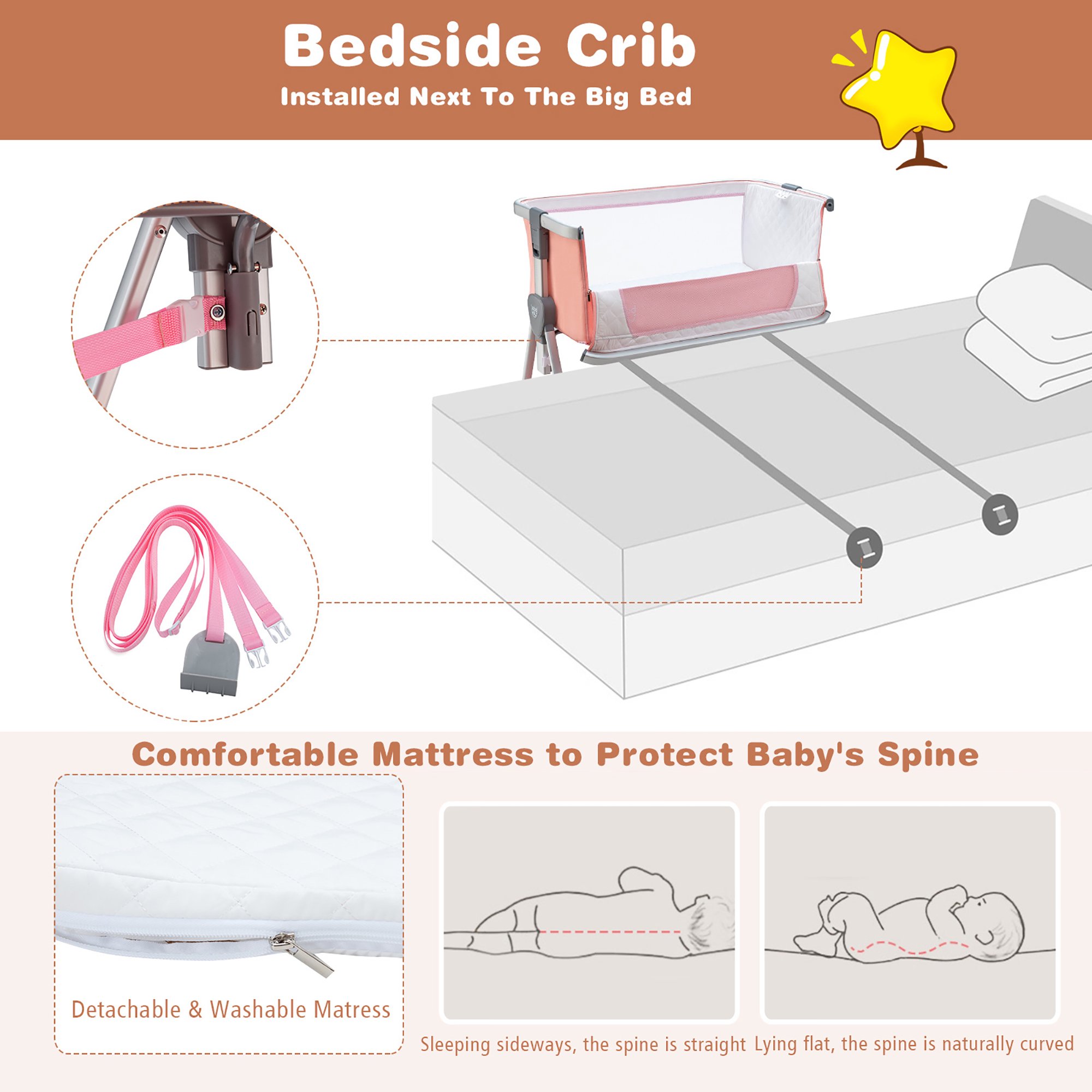 Costway Babyjoy Baby Bed Side Crib. Portable Adjustable Infant Travel Sleeper Bassinet. Peach