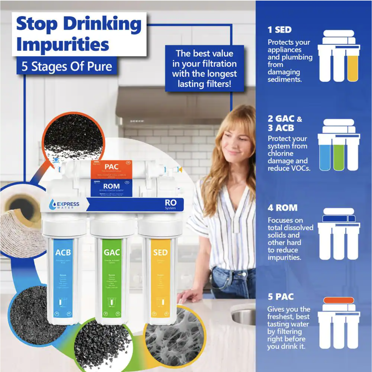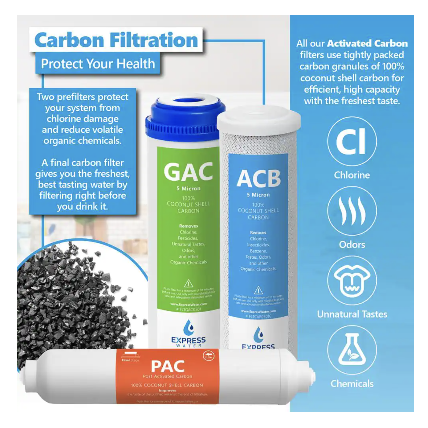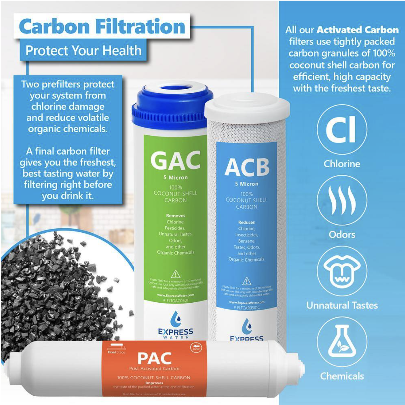 Express Water 50 Pack Activated Carbon Block Water Filter Replacement. 5 Micron - Under Sink Reverse Osmosis System