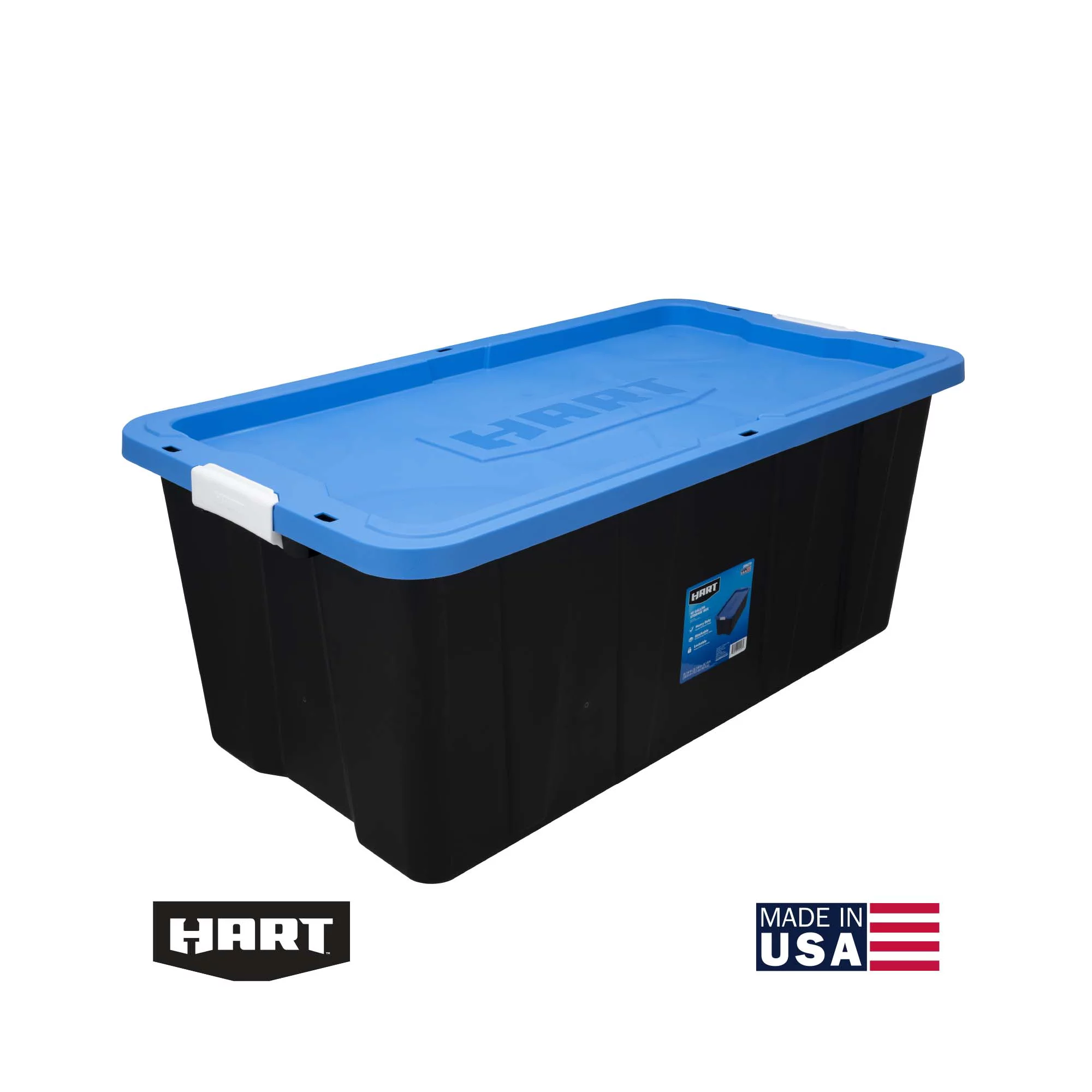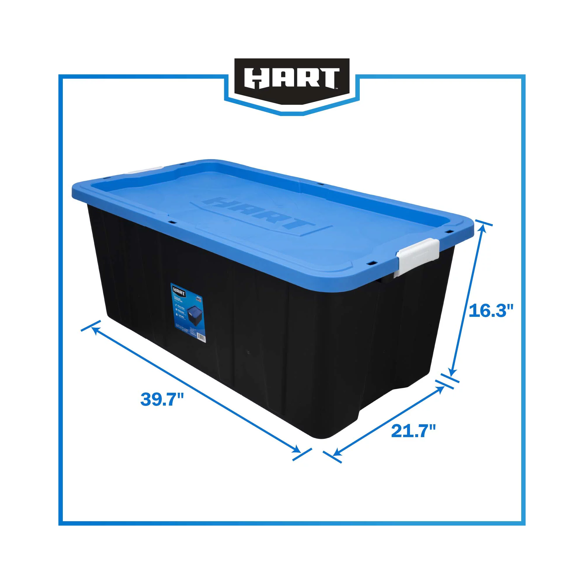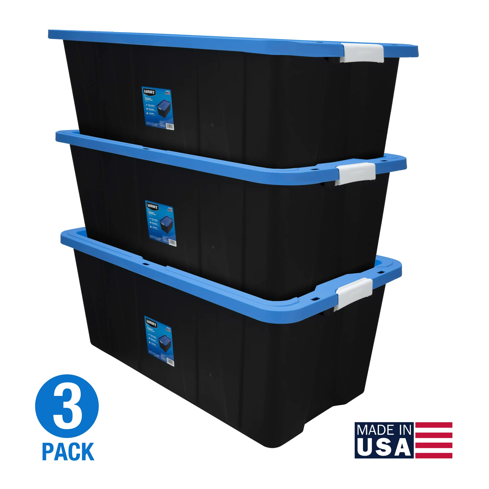 Hart 40 Gallon Heavy Duty Latching Plastic Storage Bin. Black Base/Blue Lid. Set of 3