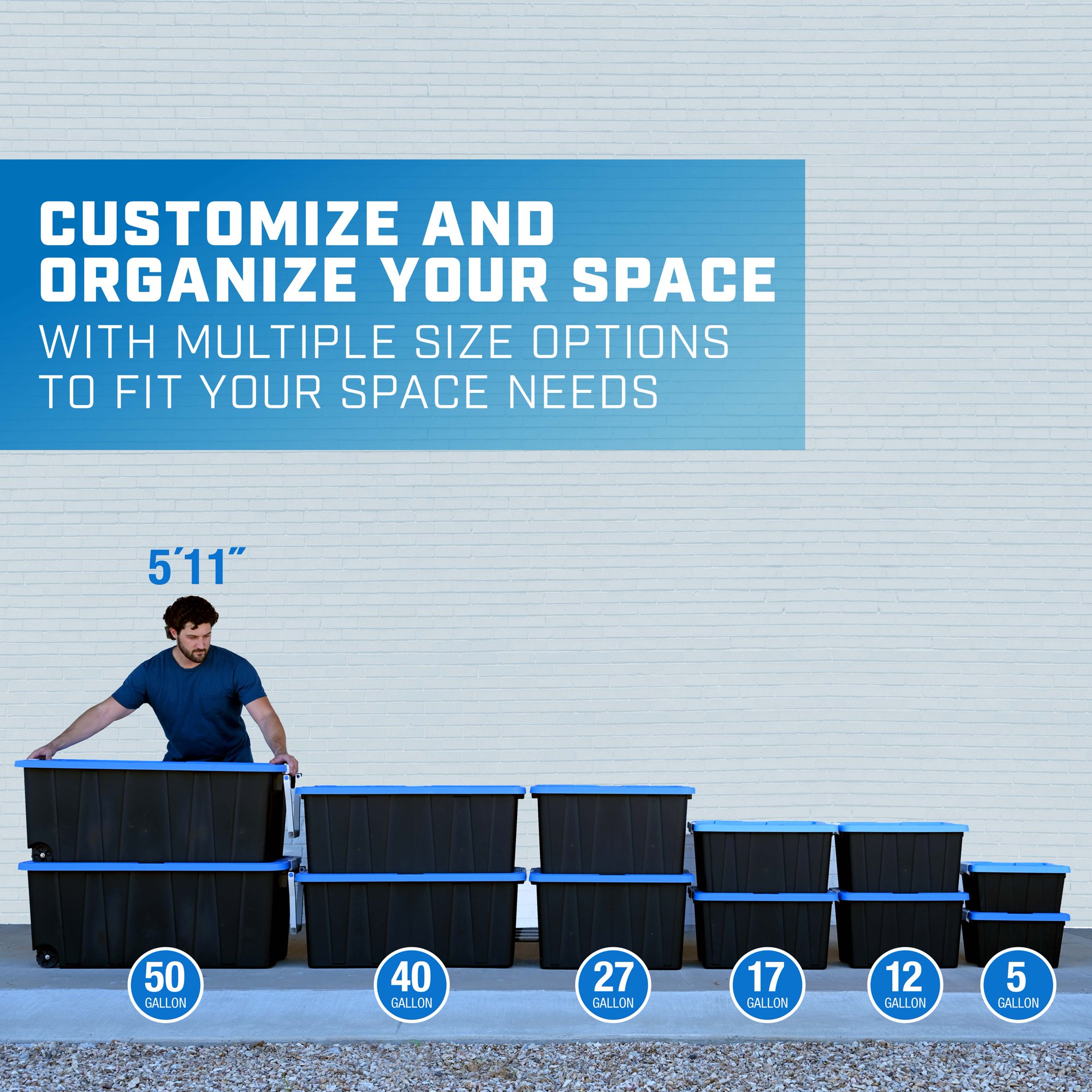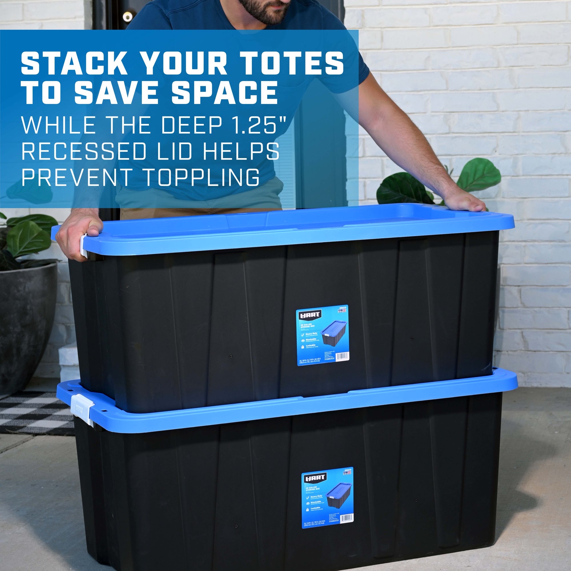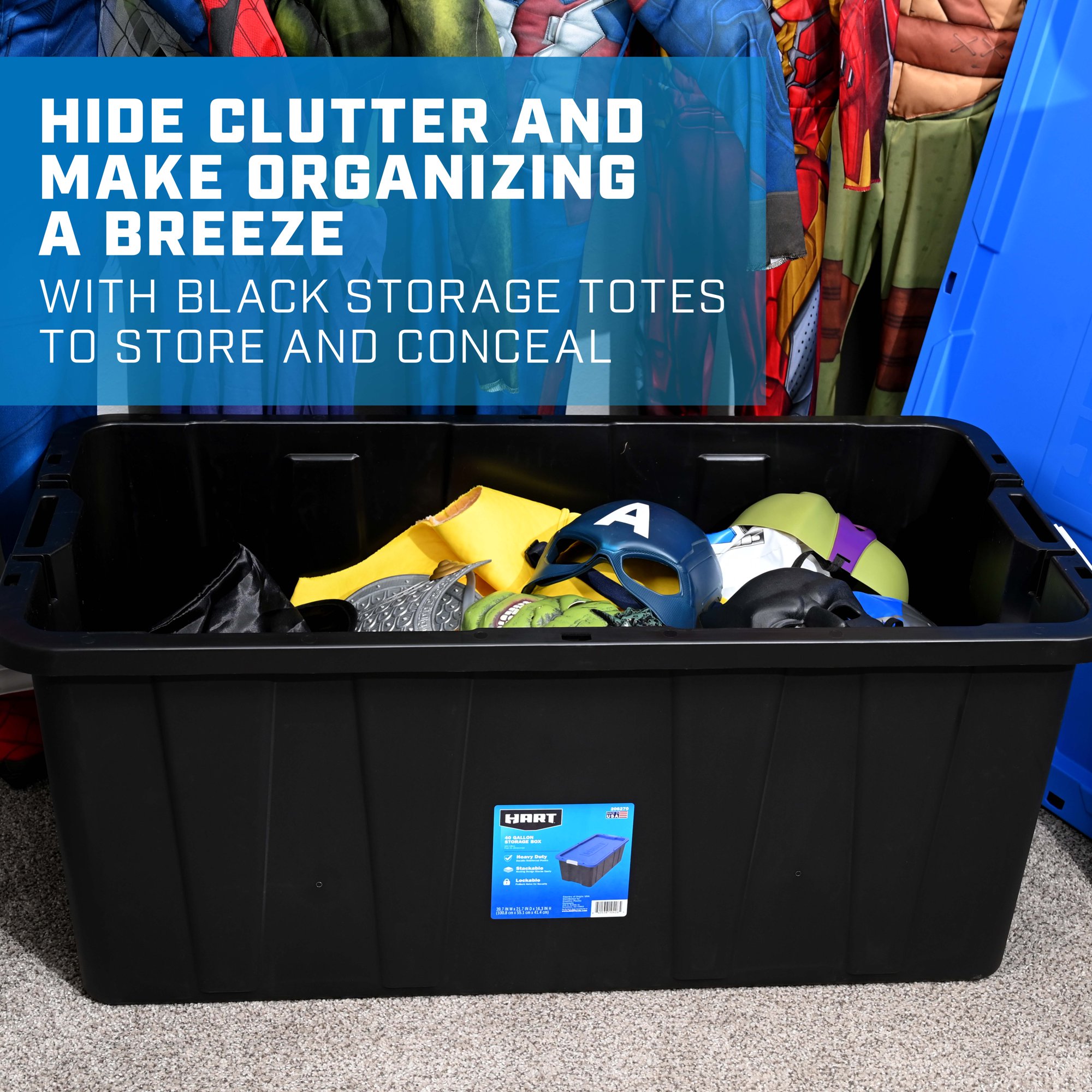 Hart 40 Gallon Heavy Duty Latching Plastic Storage Bin. Black Base/Blue Lid. Set of 3