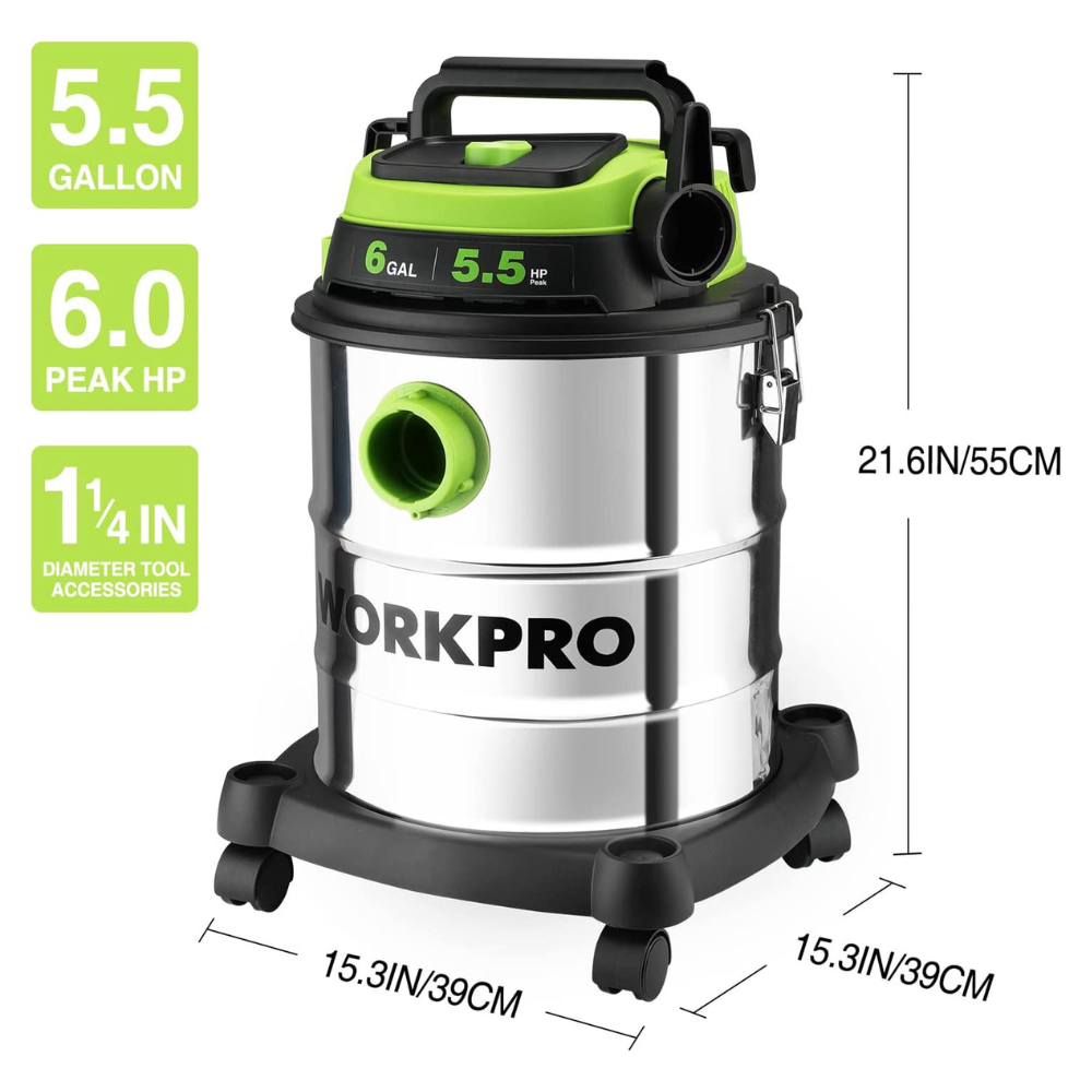 Workpro 6 Gallon Wet/Dry Shop Vacuum. 5.5 Peak HP Shop Vac Cleaner with HEPA Filter. Hose and Accessories