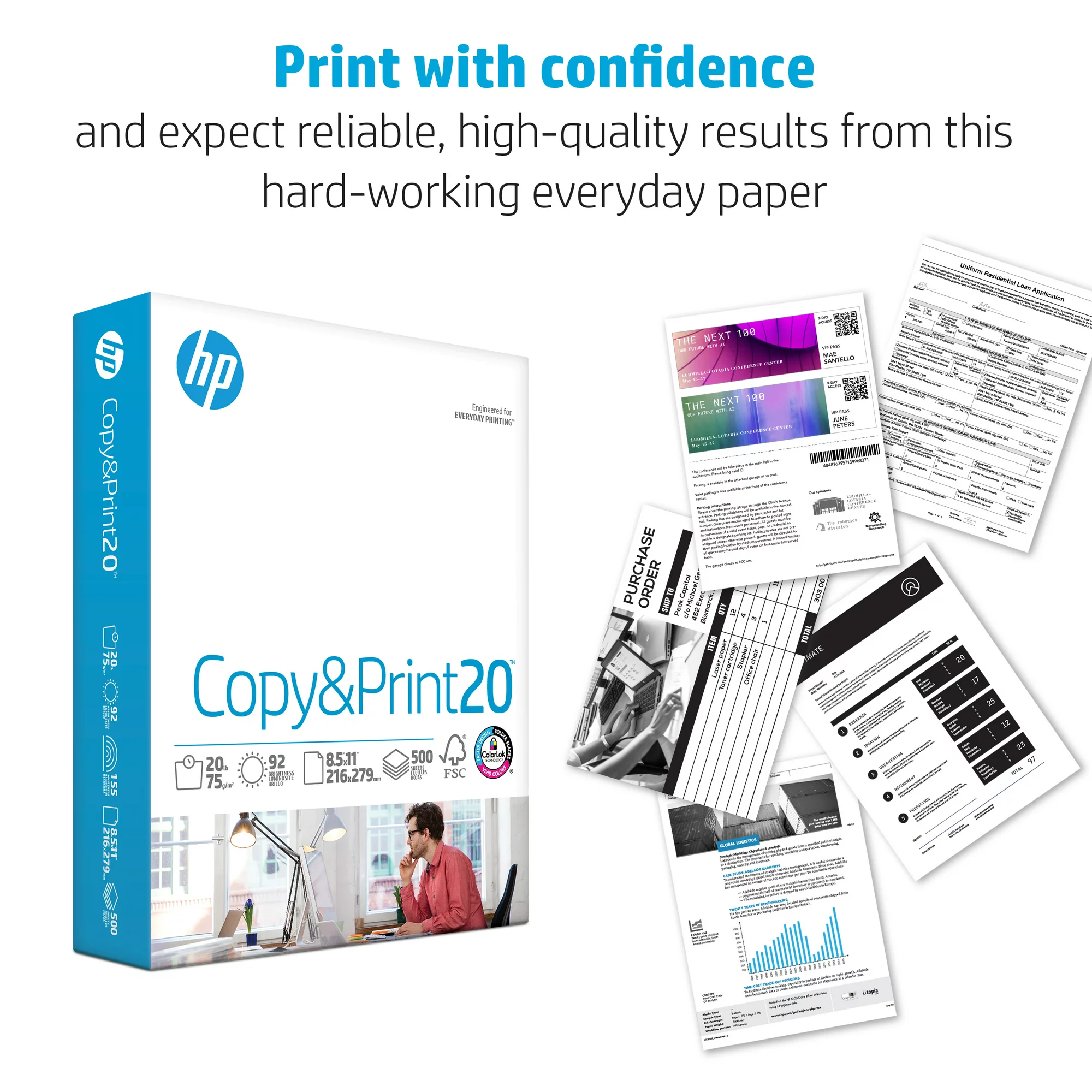 HP Printer Paper - Copy and Print. 20 lb.. 8.5″ x 11″. 2.400 Sheets. 6 Pack
