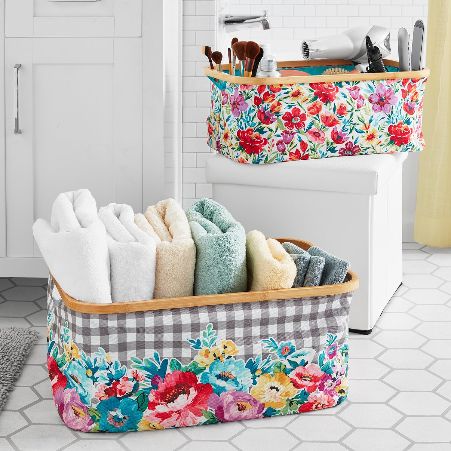 The Pioneer Woman Sweet Romance Collapsible 2-Piece Polyester Basket Set with Bamboo Rim