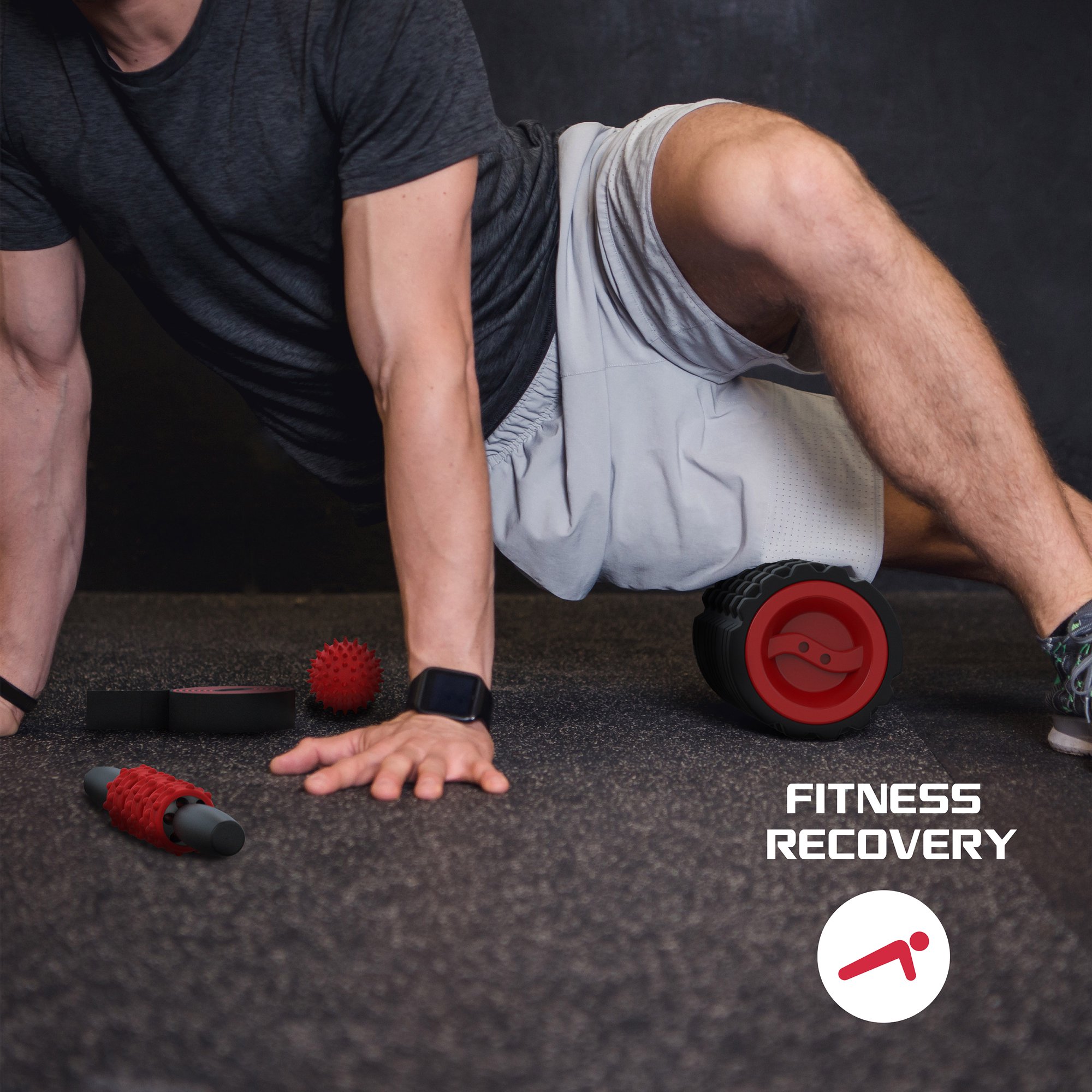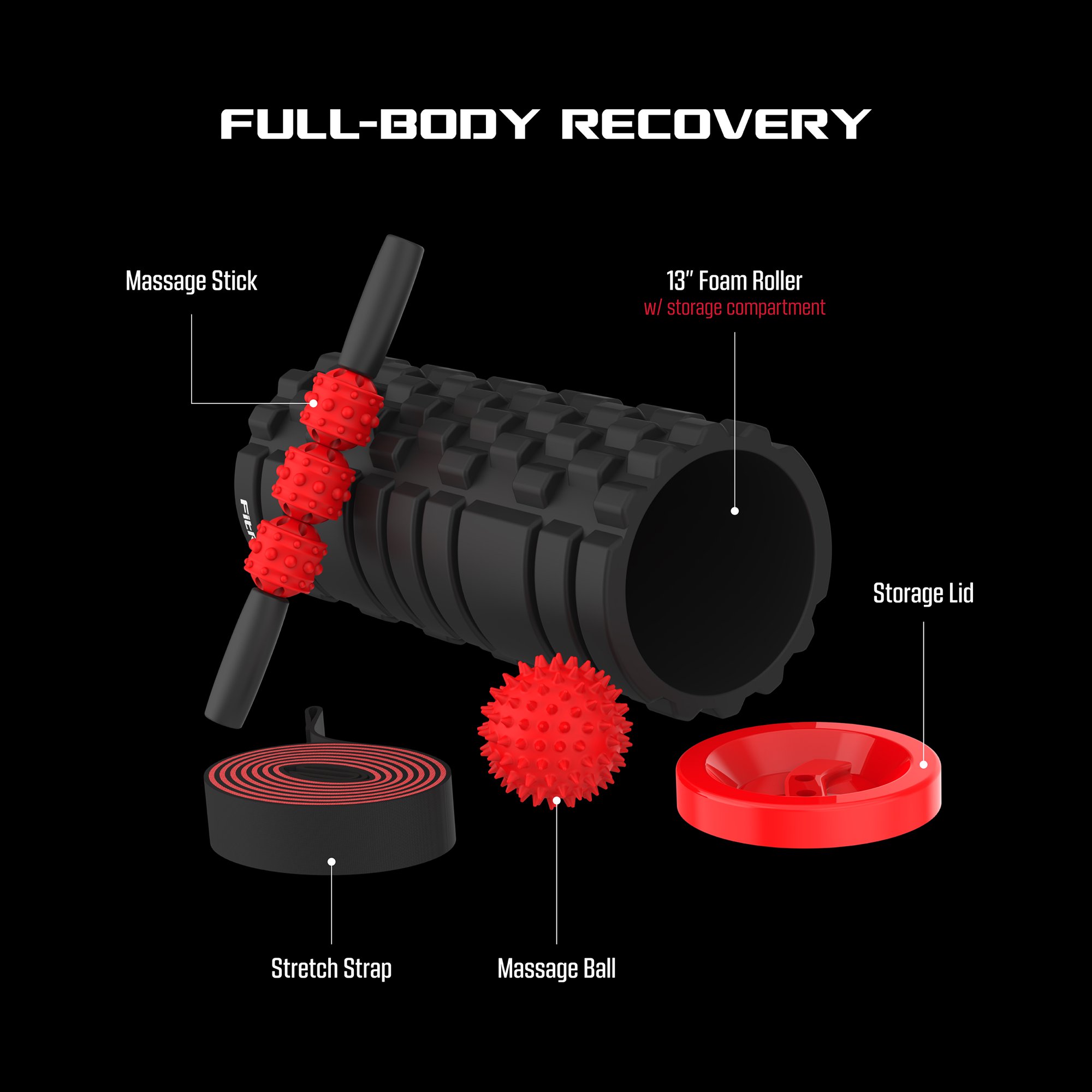 FitRx Recovery Fitness Set. Textured Foam Roller. Massage Stick. Massage Ball. and Stretch Strap