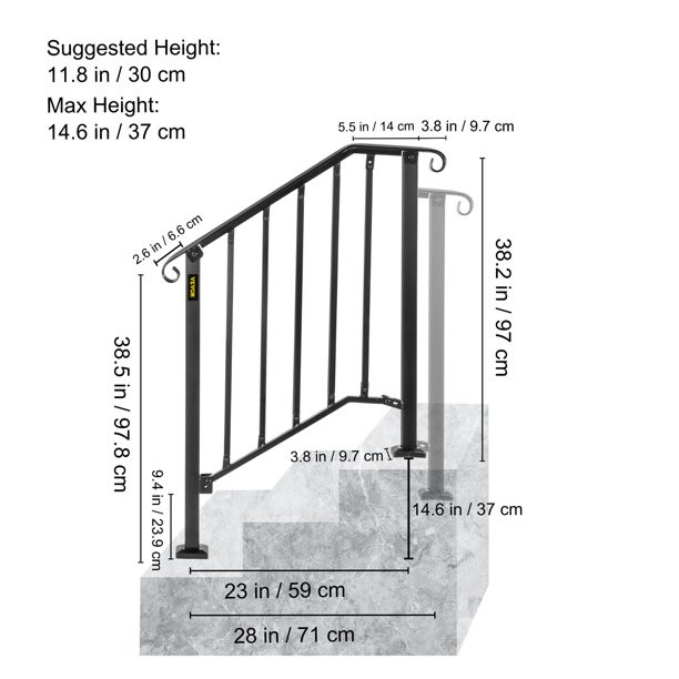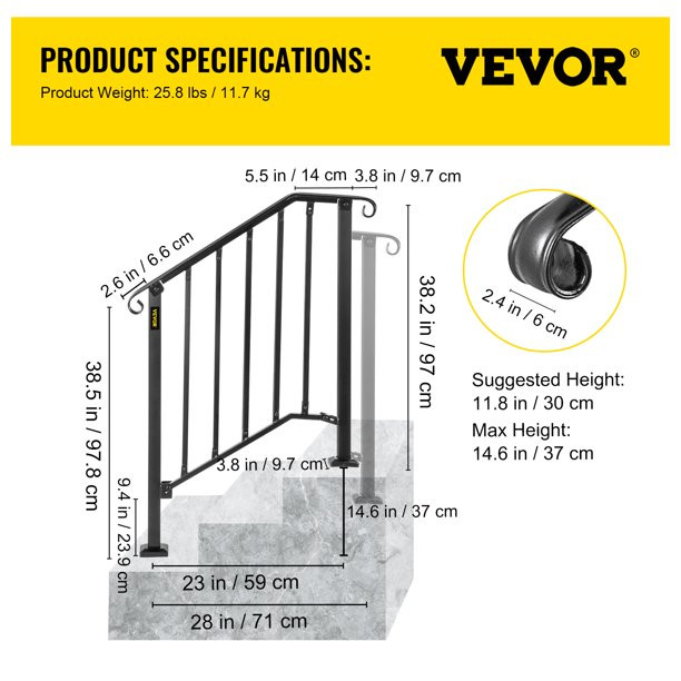 Vevor Handrail Picket 2 Fits 2 or 3 Steps Outdoor Stair Rail Wrought Iron Handrail. Matte Black