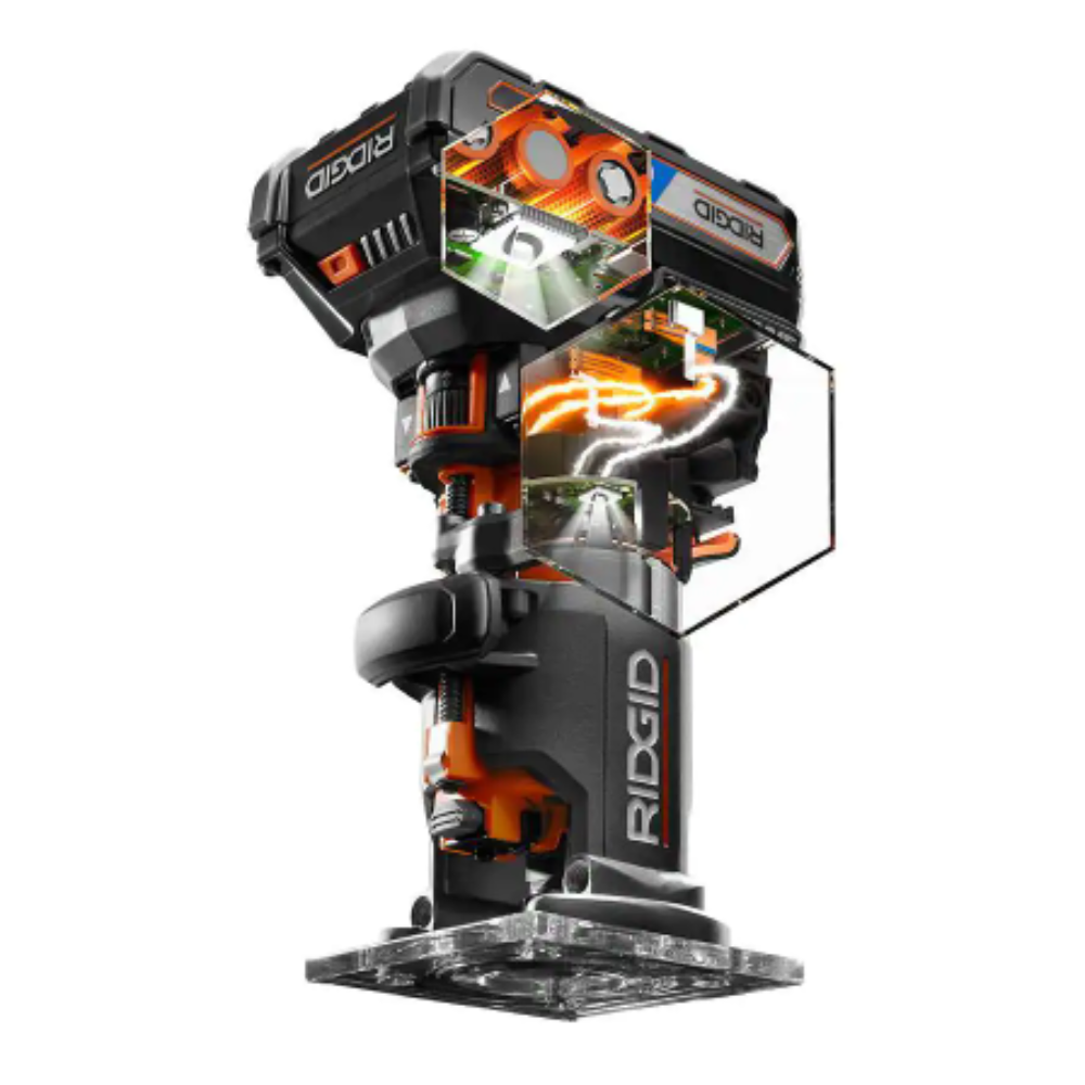 Ridgid 18V OCTANE Brushless Cordless Compact Fixed Base Router Kit w/ Bit. Bases. 18V Lithium-Ion 2.0 Ah Battery. and Charger
