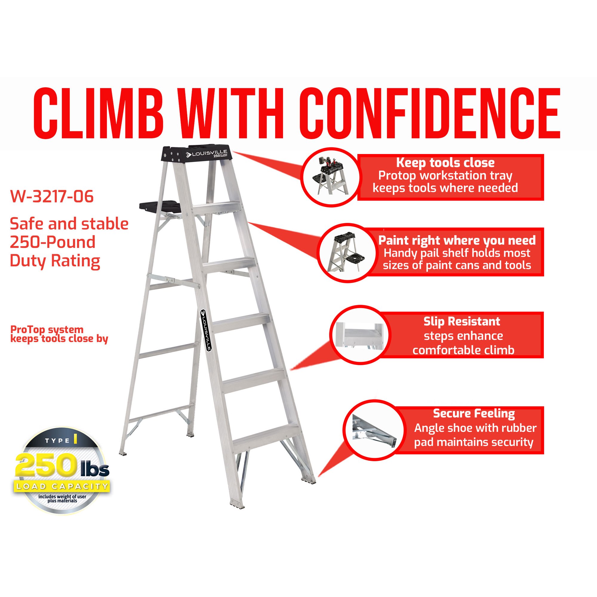 Louisville Ladder 6′ Aluminum Step Ladder. 10′ Reach. 250 lbs Load Capacity
