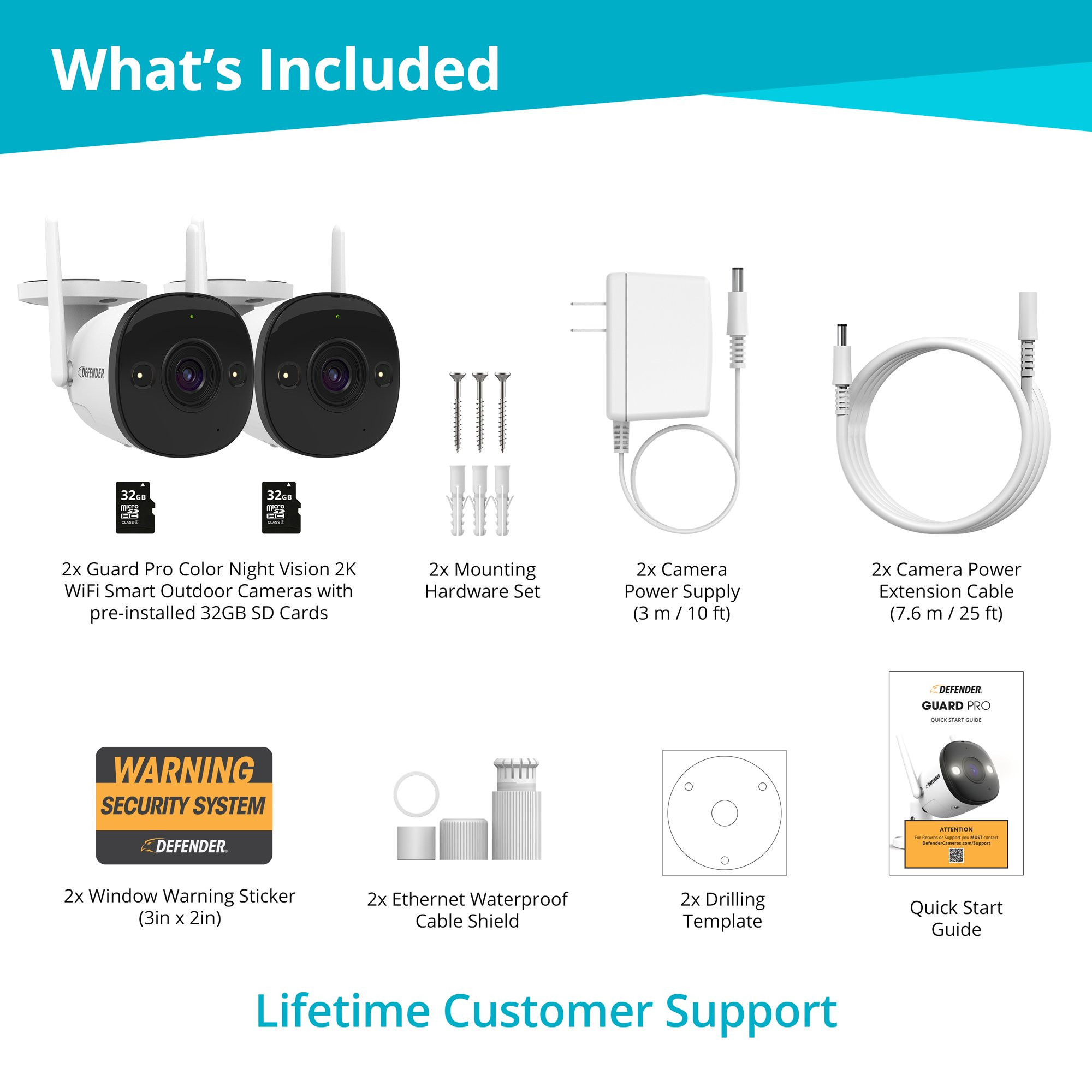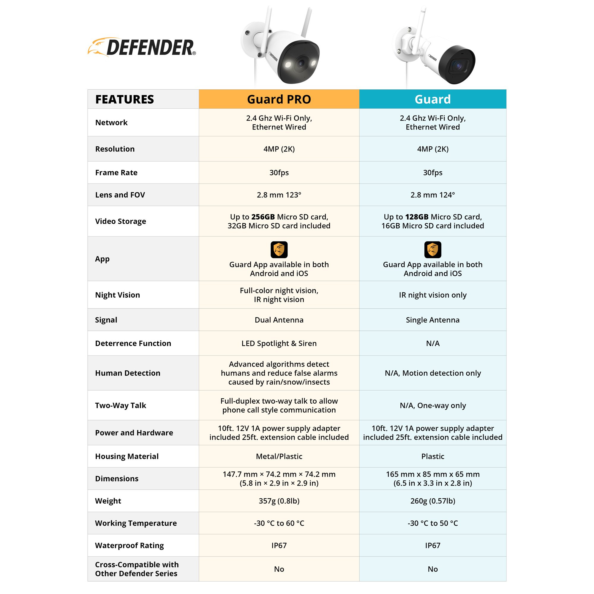 Defender Guard Pro 2K WiFi. Plug-in Power Security Camera with Color Night Vision. Two-Way Talk. 32 GB SD Cards. 2 Pack