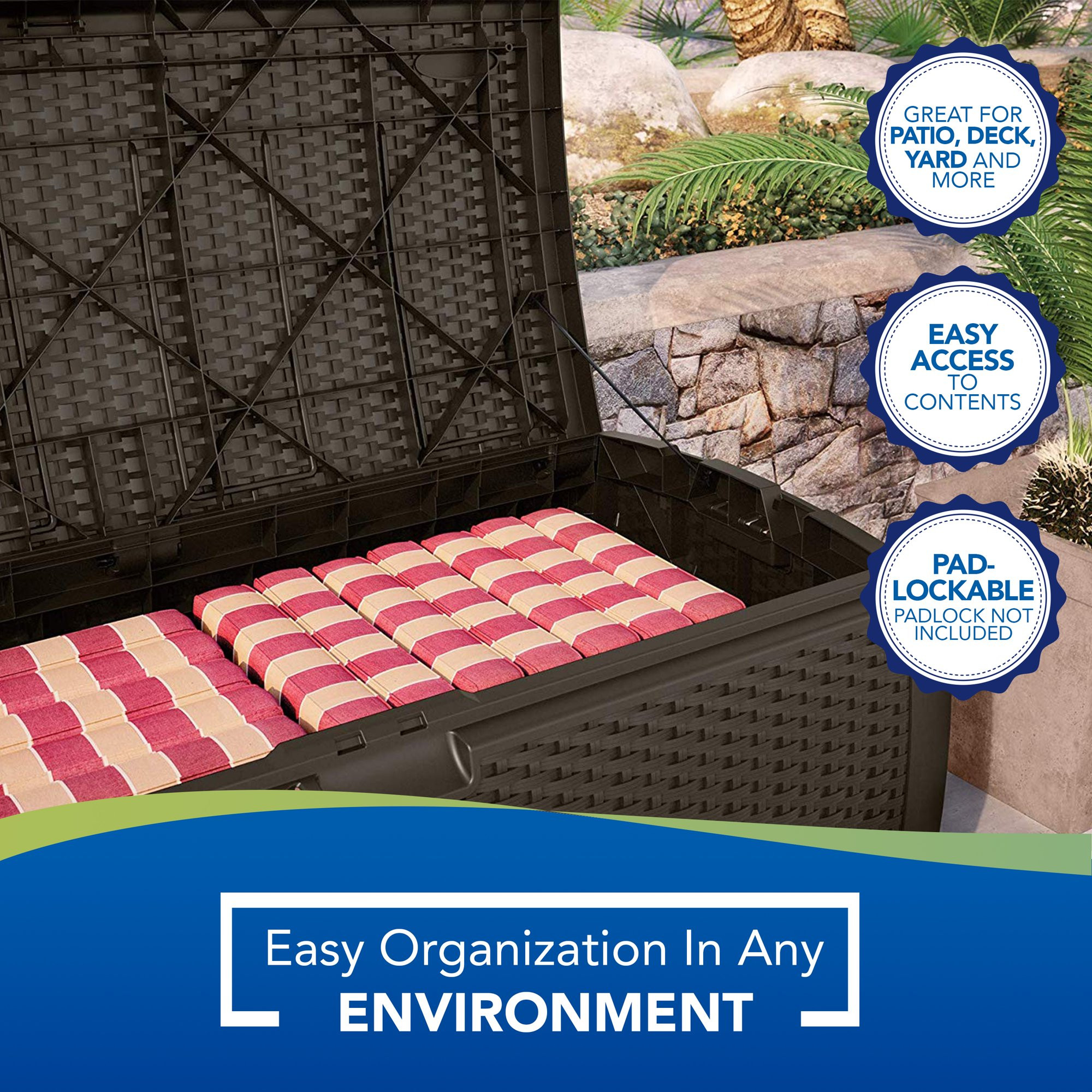 Suncast Outdoor 99 Gallon Resin and Wicker Deck Box. Java Brown (DBW9200)